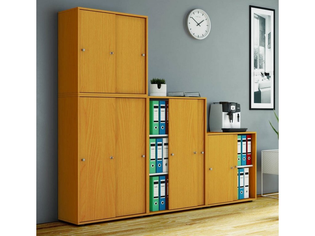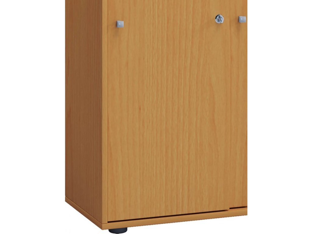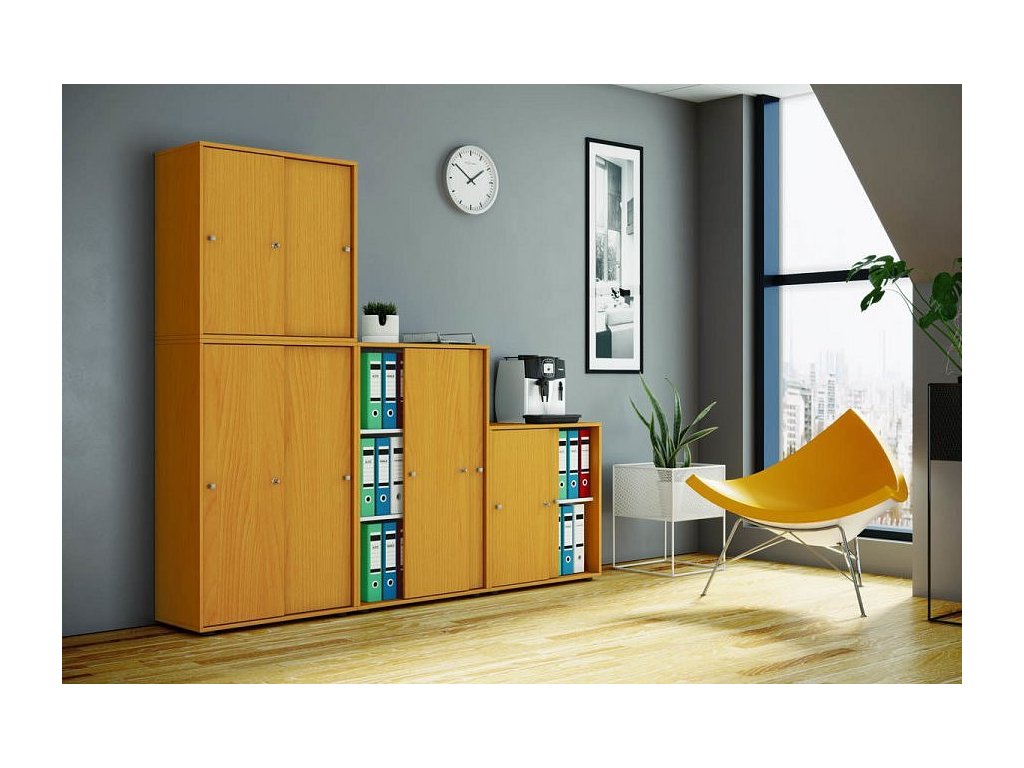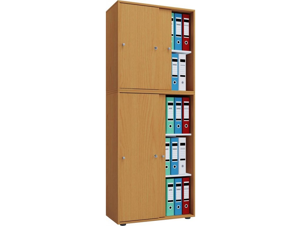 Skříň se čtyřmi policemi poskytuje dostatek úložného prostoru, například pro 35 složek, ale i mnoho dalšího. Praktické posuvné dveře jsou opatřeny zámkem.