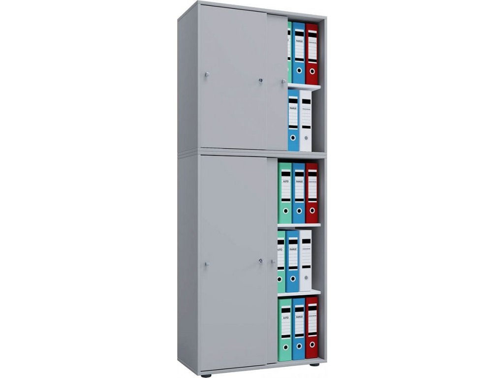 Skříň se čtyřmi policemi poskytuje dostatek úložného prostoru, například pro 35 složek, ale i mnoho dalšího. Praktické posuvné dveře jsou opatřeny zámkem.