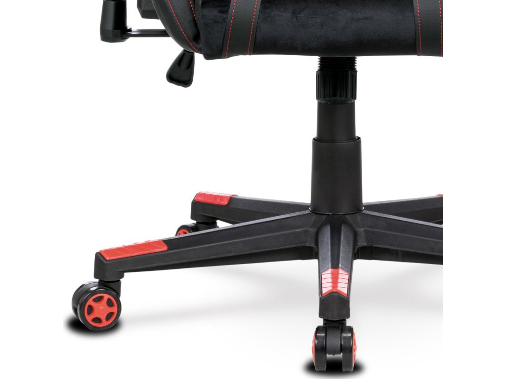 Herní křeslo E-racer v černé barvě kombinuje sametovou látku s ekokůží, což zajišťuje příjemný dotek a snadnou údržbu. Pevná plastová podnož je vybavena pěti kolečky pro snadnou mobilitu a stabilitu. Křeslo disponuje houpacím mechanismem umožňujícím nastavení opěradla až do polohy 180°, což přispívá k maximálnímu pohodlí během dlouhých herních sezení. Výškově nastavitelné sedadlo a jednosměrné 1D područky umožňují přizpůsobení podle individuálních potřeb uživatele. Celkový design s výrazným červeným prošitím a ergonomickým tvarem opěradla podporuje správné držení těla a komfort při práci i hraní.