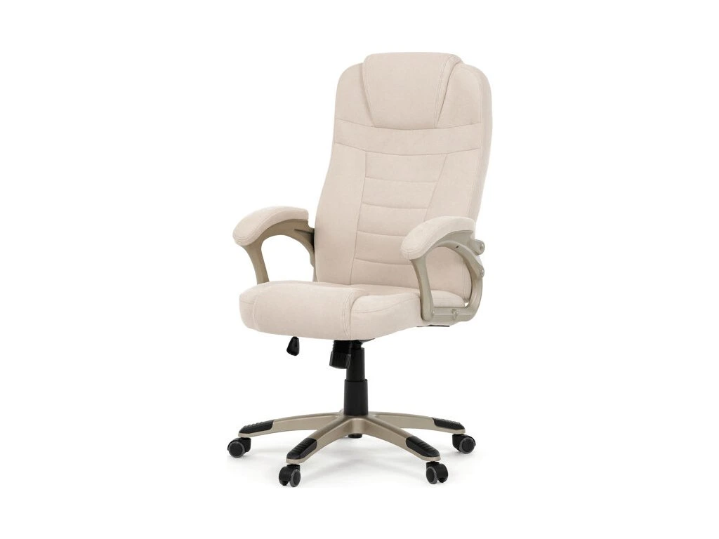 Kancelářské křeslo v béžovém provedení kombinuje komfort s praktickým designem vhodným pro dlouhodobé sezení. Čalounění z kvalitní látky zajišťuje příjemný povrch a snadnou údržbu, zatímco pevné područky s měkkým polstrováním podporují pohodlí paží. Vysoký opěrák je doplněn pevnou opěrkou hlavy s vyměkčenou vrchní částí, která přispívá k lepší podpoře krční páteře. Houpací mechanismus umožňuje nastavení polohy sedáku a výšková nastavitelnost zajišťuje ergonomické přizpůsobení uživateli. Stabilní základna z plastu v odstínu champagne je vybavena kolečky vhodnými pro tvrdé povrchy, což usnadňuje mobilitu a zároveň chrání podlahu.