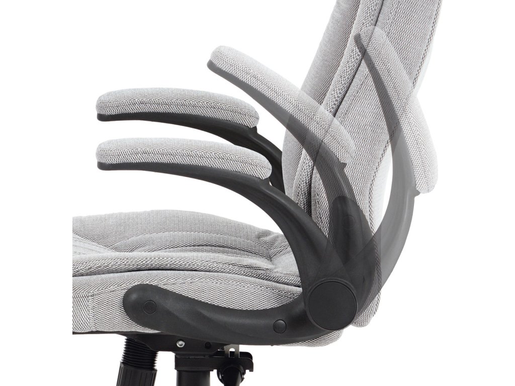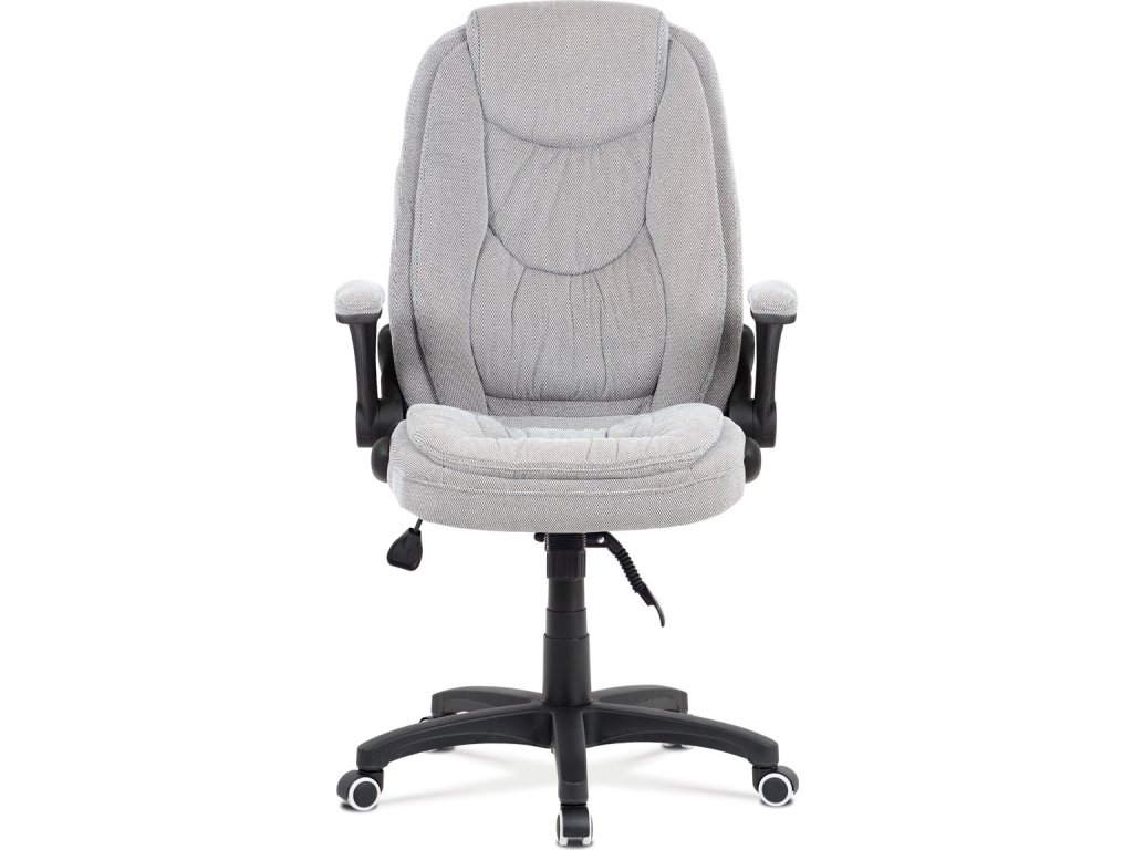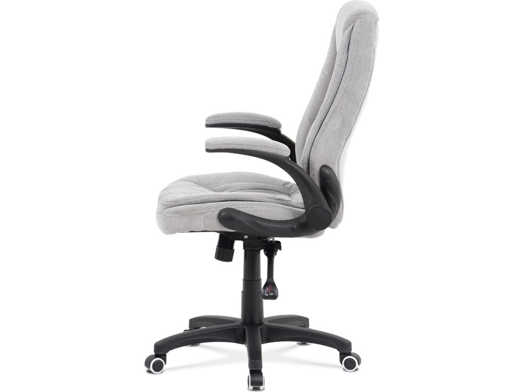 Kancelářská židle v šedé látce nabízí ergonomicky tvarované opěradlo s vyměkčenou vrchní částí pro zvýšený komfort při delším sezení. Odklápěcí čalouněné područky umožňují flexibilní využití a snadné zasunutí židle pod stůl. Synchronní mechanismus zajišťuje plynulé nastavení opěradla v závislosti na pohybu uživatele, což podporuje správné držení těla. Plastový černý kříž je lehký a zároveň stabilní, vybavený kolečky vhodnými pro různé typy podlah. Výškově nastavitelná sedací plocha umožňuje přizpůsobení individuálním potřebám uživatele.