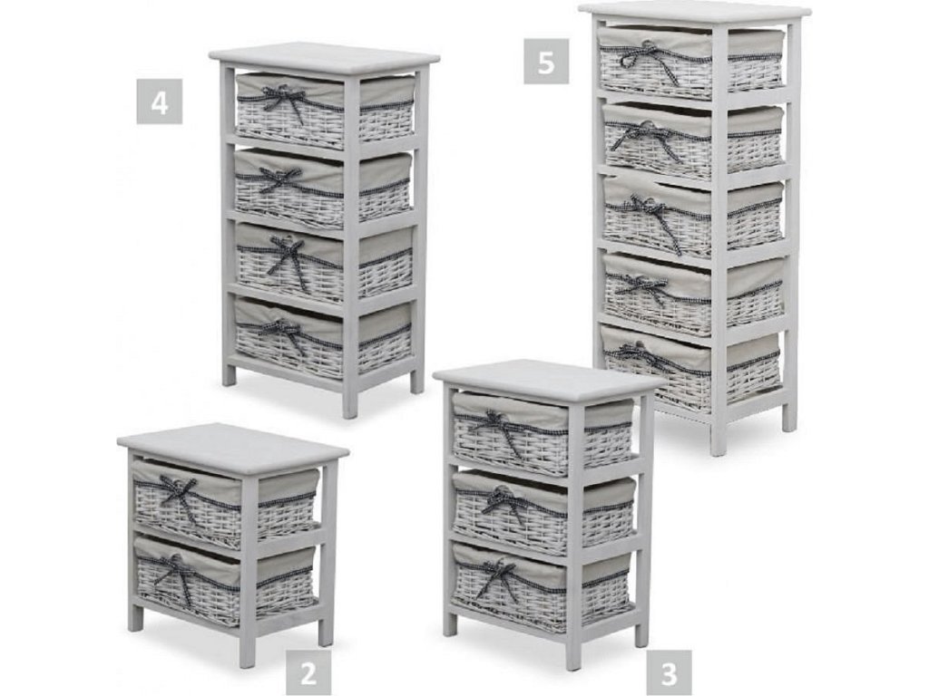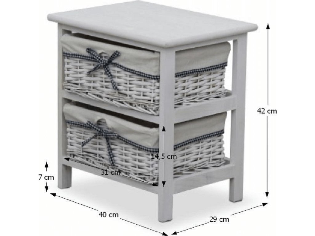 komoda (případně noční stolek) s pevným rámem a 2 proutěnými košíky, materiál dřevo / proutí, kombinace starobílé barvy, rozměry (ŠxVxH) 40x42x29 cm.