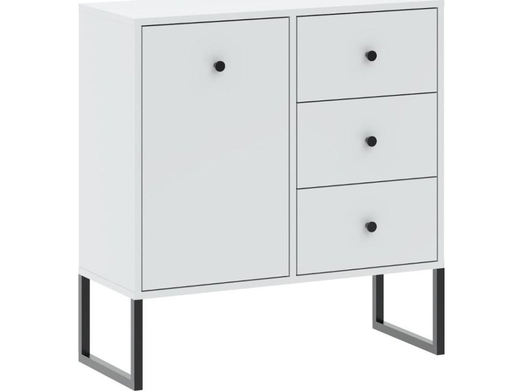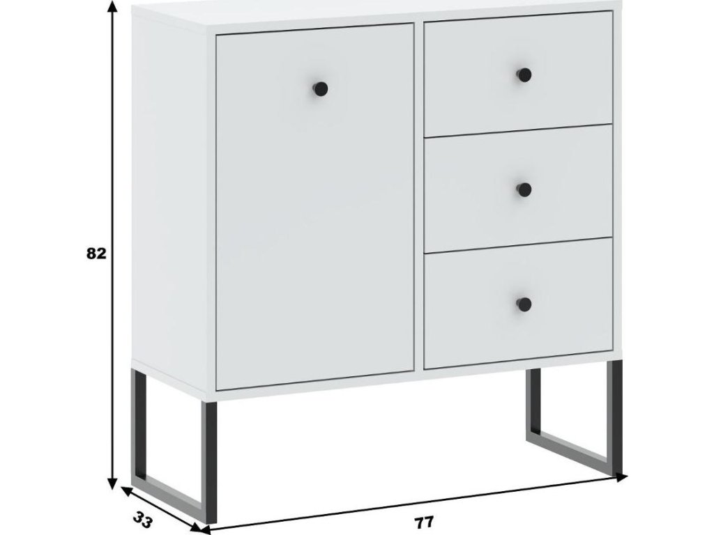 CASA 85034 Komoda jednodveřová se třemi zásuvkami v loftovém stylu, je vyrobena z kvalitní LTD desky v barevném provedení bílá. Konstrukce nožek je kovová v černé barvě. V naší nabídce naleznete více variant nábytku této řady. Dodáváme v demontovaném stavu.