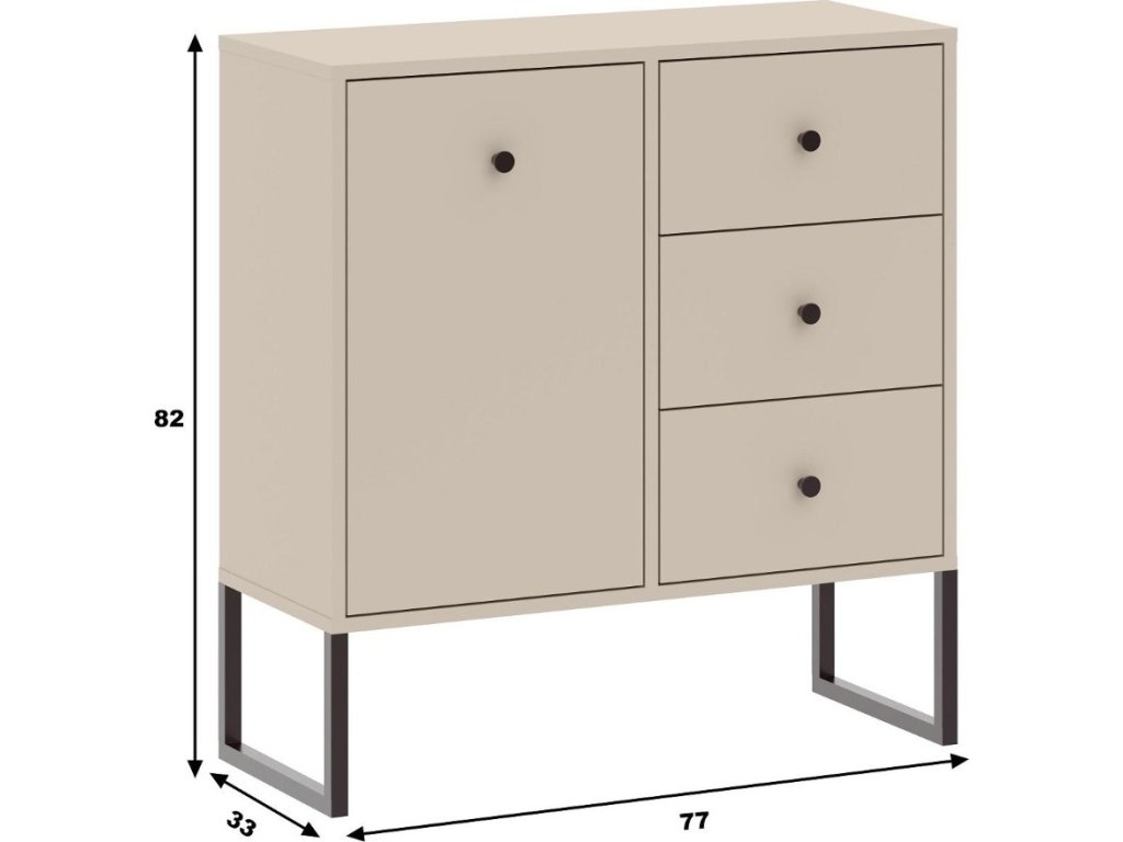 CASA 85034 Komoda jednodveřová se třemi zásuvkami v loftovém stylu, je vyrobena z kvalitní LTD desky v barevném provedení kašmír. Konstrukce nožek je kovová v černé barvě. V naší nabídce naleznete více variant nábytku této řady. Dodáváme v demontovaném stavu.