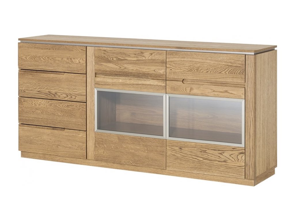 CASA 75021 Komoda dvoudveřová prosklená. Jednoduché linie a kvalitní zpracování ve spojení s nadčasovým designem této řady dodají vaší jídelně nebo obývacímu pokoji jedinečný vzhled. Povrch vnějších částí je ošetřen olejem. Korpus je z vnější strany doplněn přírodní dubovou dýhou, vnitřní strana je z desky LTD v barvě přírodního dřeva. Komoda má v levé části 4 zásuvky, část s dvířky je prosklená. Dvířka jsou vyrobeny z masivního dubu rustikal. Úchyty jsou vyfrézované do přední desky. Možnost dokoupení LED osvětlení. Dodáváme již ve smontovaném stavu.