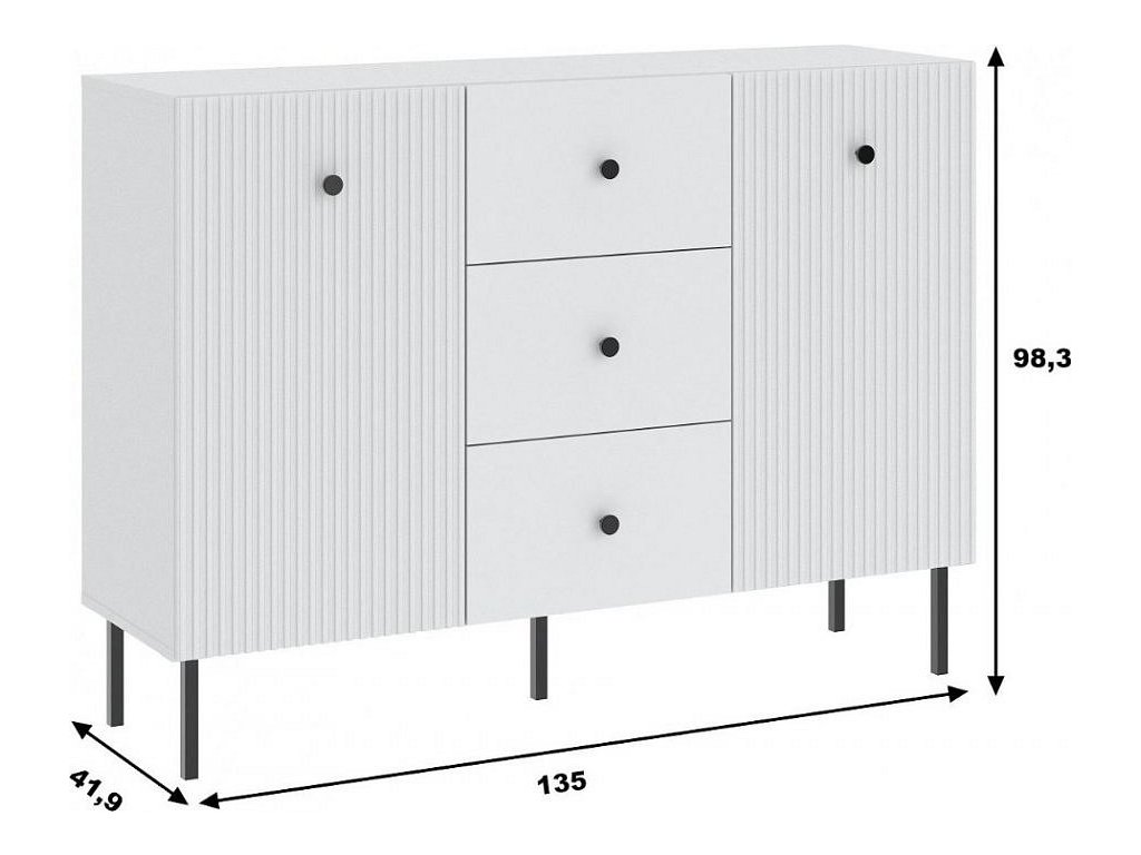 CASA 85039 Komoda dvoudveřová se třemi zásuvkami v elegantním stylu, je vyrobena z kvalitní LTD desky v barevném provedení bílá. Přední část nábytku je doplněna dekorem frézovaných dveří. Vysoké kovové nožky nábytku a úchyty jsou v barevném provedení černá. V naší nabídce naleznete více variant nábytku této řady. Dodáváme v demontovaném stavu.