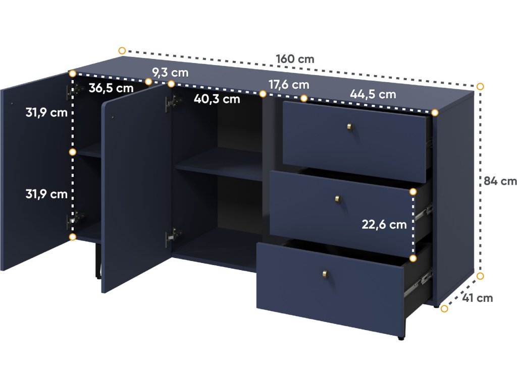 Komoda dvoudvéřová se třemi zásuvkami. Dvířka a zásuvky mají soft close - systém tichého dovírání. Kolekce moderních komod je určena pro ty, kteří milují barevné prostory, ale také pro ty, kteří dávají přednost vnesení barvy do interiéru pomocí jednoho výrazného prvku. Není žádným tajemstvím, že barva v interiéru hraje obrovskou, téměř klíčovou roli. Její výběr ovlivňuje nejen celkový vzhled místnosti, ale především naši náladu. Rozměry viz obrázek. Barevné provedení - tmavě modrá granát, úchyty jsou tvarované zlaté. Dodáváme v demontovaném stavu.