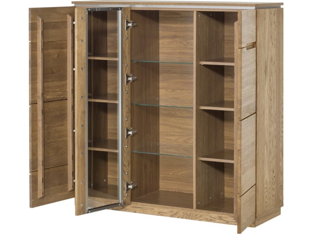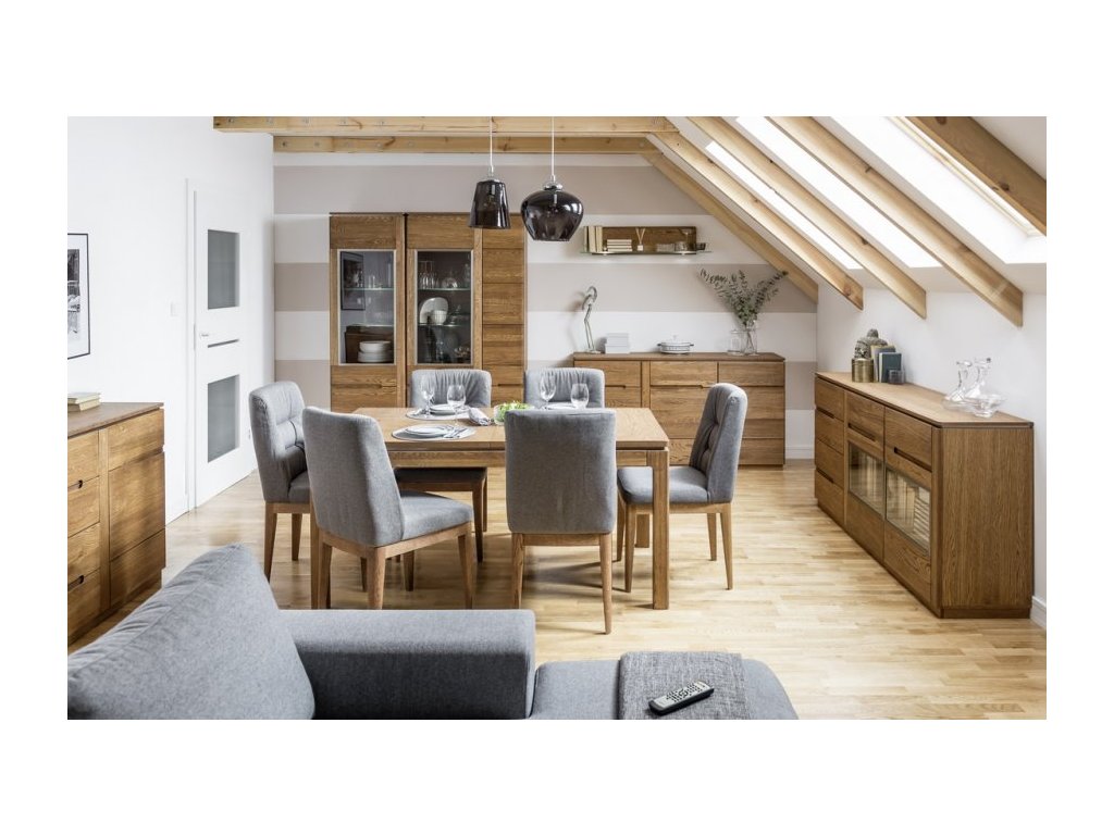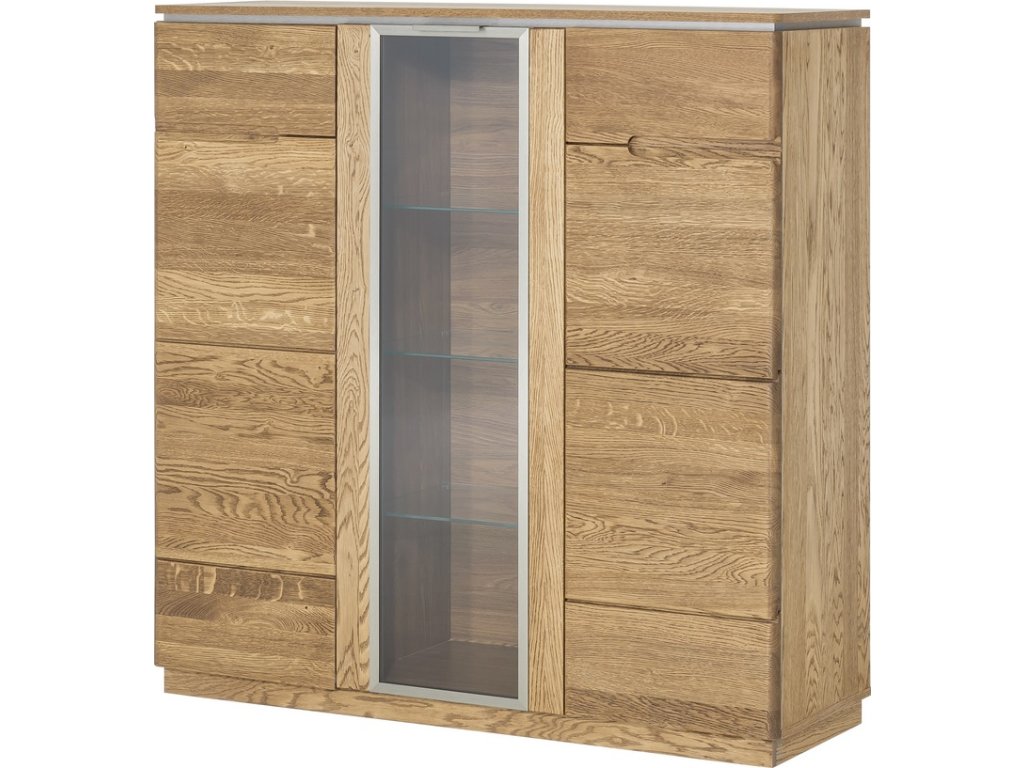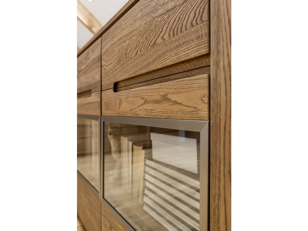 CASA 75021 Komoda třídveřová prosklená. Jednoduché linie a kvalitní zpracování ve spojení s nadčasovým designem této řady dodají vaší jídelně nebo obývacímu pokoji jedinečný vzhled. Povrch vnějších částí je ošetřen olejem. Korpus je z vnější strany doplněn přírodní dubovou dýhou, vnitřní strana je z desky LTD v barvě přírodního dřeva. Dvířka jsou vyrobeny z masivního dubu rustikal, sklo je tvrzené v ocelovém rámu. Úchyty jsou vyfrézované do přední desky, ve střední části je úchyt kovový integrovaný v rámu skla. Možno dokoupit LED osvětlení. Dodáváme již ve smontovaném stavu.