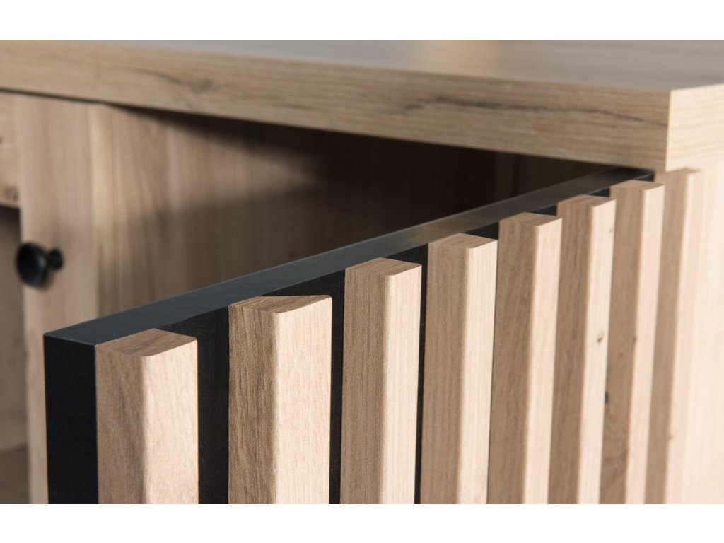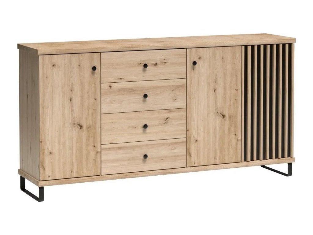 Komoda třídveřová se čtyřmi zásuvkami s netradičním provedením detailu dvířek s lamelami. Kolekce nábytku v sobě spojuje jednoduchost, originální vzhled a funkčnost. Barevné provedení je v kombinaci dub artisan/černá mat. Nábytek je vyroben z kvalitního lamina ohraničeného ABS páskou, dekorační lamely jsou vyrobeny z desky MDF. Zásuvky jsou vybaveny kovovými pojezdy se systémem tichého dovírání. Kolekce se skládá z mnoha prvků a tento široký výběr Vám zaručí sestavit si nábytek podle svých vlastních představ a přání. Komoda je doplněn kovovými nohami v černé barvě. Dodáváme v demontovaném stavu.