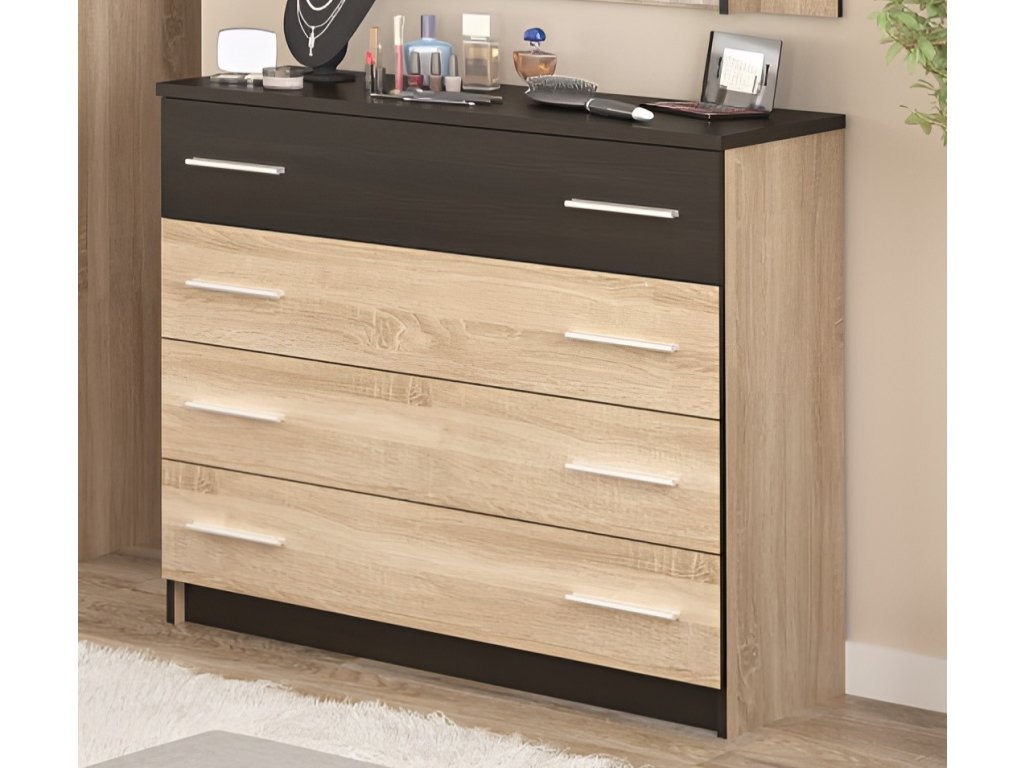 CASA 97003 Komoda se 4 zásuvkami z ložnicové řady. Moderní provedení v kontrastních barvách dokonale doplní váš interiér. Komoda je vyrobena z kvalitní LTD desky v barevné kombinaci dub sonoma/wenge. Nabídka komponentů této sektorové řady umožňuje sestavit si nábytek do ložnice nebo studentského pokoje dle vlastních představ. Dodáváme v demontovaném stavu.
