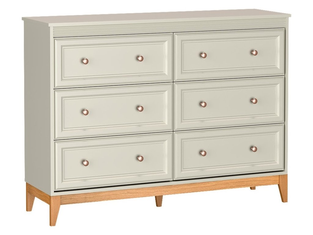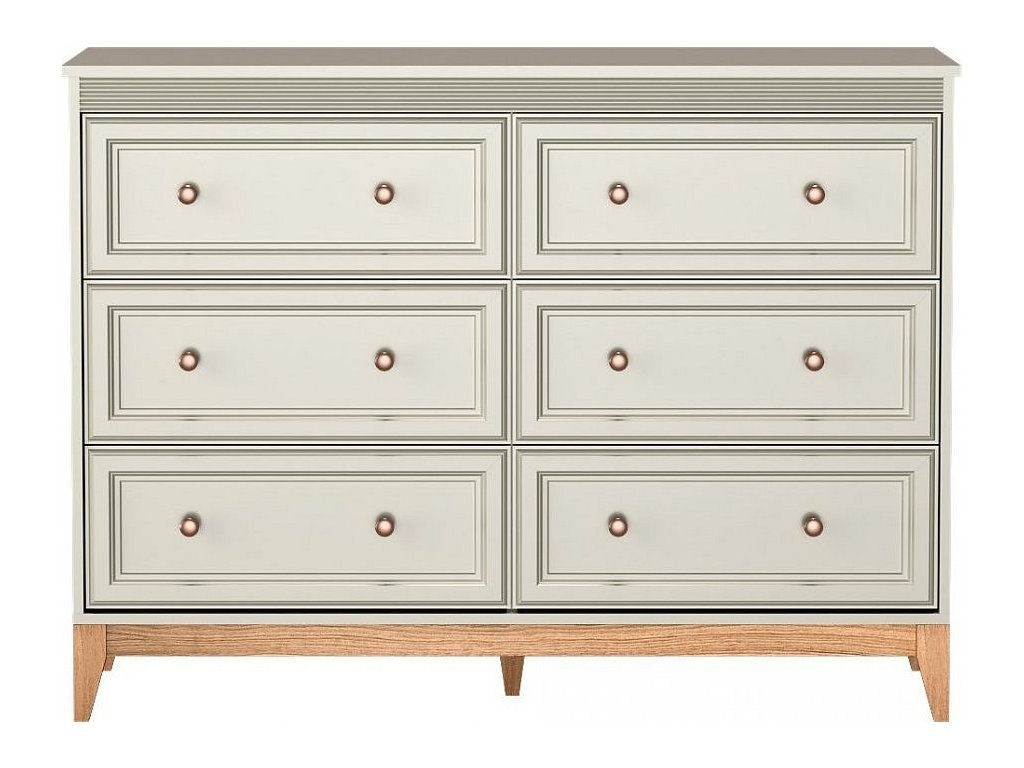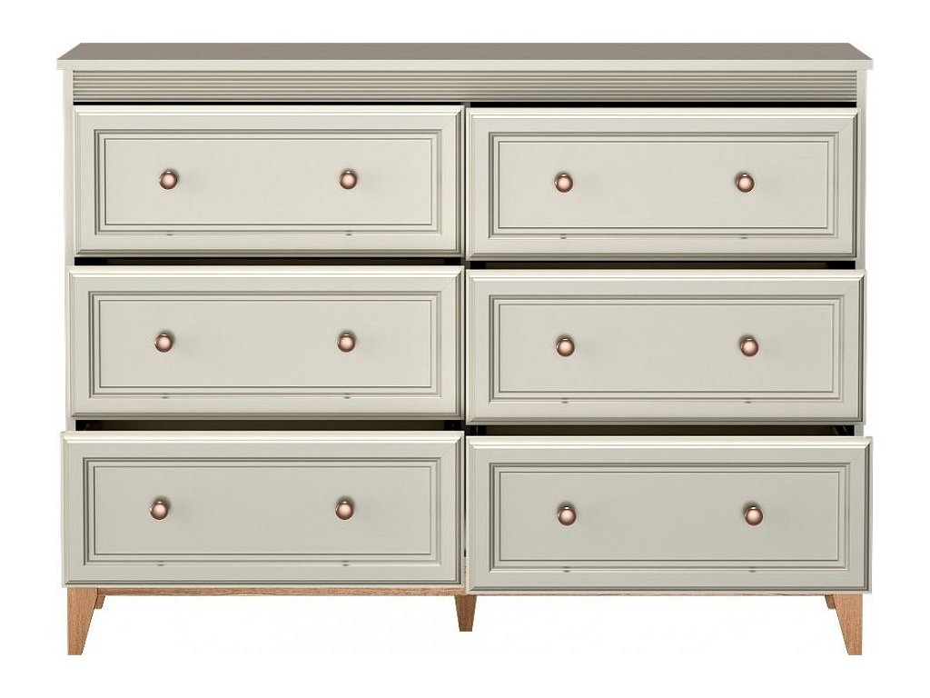 Komodu podepírají nožky z masivního dubového dřeva o výšce 15 cm, které jsou pevné a stabilní. Odolné laminované desky u korpusu a MDF deska u frontu (čela) nábytku s ABS hranami přispívají k dlouhé životnosti. Úchyty jsou kovové měděné barvy.