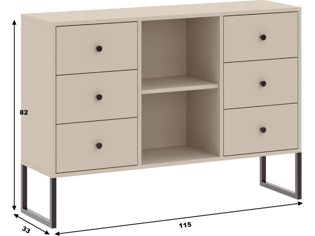 CASA 85034 Komoda se šesti zásuvkami v loftovém stylu, je vyrobena z kvalitní LTD desky v barevném provedení kašmír. Konstrukce nožek je kovová v černé barvě. V naší nabídce naleznete více variant nábytku této řady. Dodáváme v demontovaném stavu.