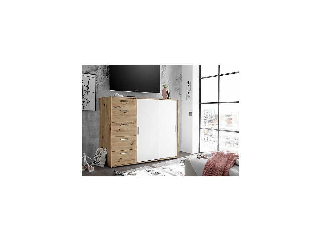Komoda CASE je praktický a prostorný kus nábytku, který vám nabídne dostatek úložného prostoru. S rozměry 152 cm na šířku, 127 cm na výšku a 60 cm na hloubku je ideálním řešením pro ložnice, obývací pokoje nebo pracovny. Komoda disponuje dvěma posuvnými dveřmi, které šetří místo, a pěti prostornými zásuvkami, které vám umožní efektivně uspořádat vaše věci.