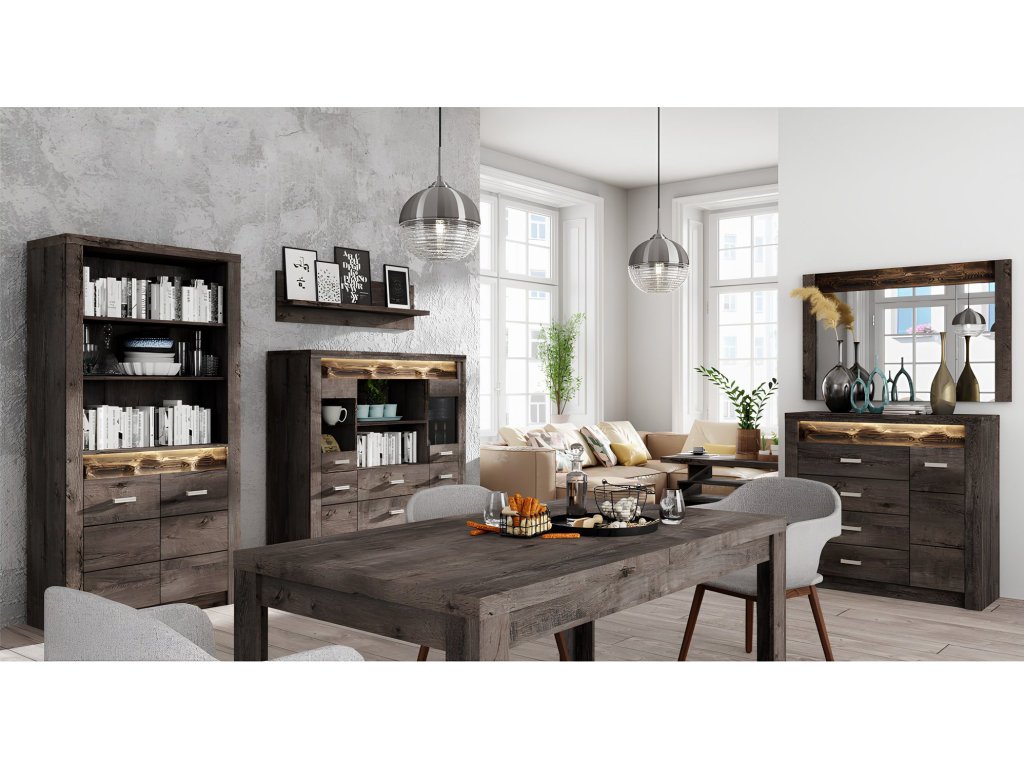 Luxusní komoda INFINITY I-07 v dekoru jasan tmavý. Nábytek vysoké kvality v masivním designu s prvky surového malovaného dřeva. Je vyrobena z kvalitního lamina o tloušťce 16 mm, úchytky kovové. Hrubý korpus až 48 mm.Komodu je možné doplnit LED osvětlením a dalšími komponenty z řady INFINITY ve stejném designu. Dodáváme v demontovaném stavu.
