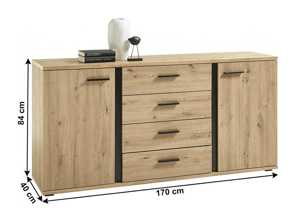 Komoda v rustikální stylu KANODE v dekoru dub artisan v kombinaci s černou. Má dostatek úložného prostoru a je vhodná do každého interiéru. Je vyrobena z kvalitního lamina o tloušťce 16 mm. Tato komoda skvěle doplní obývací stěnu KANODE ve stejném designu. Dodáváme v demontovaném stavu.