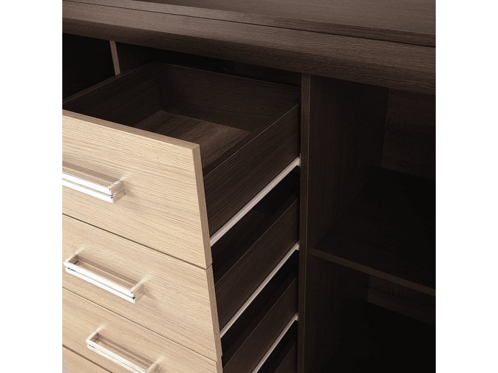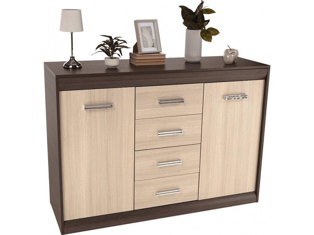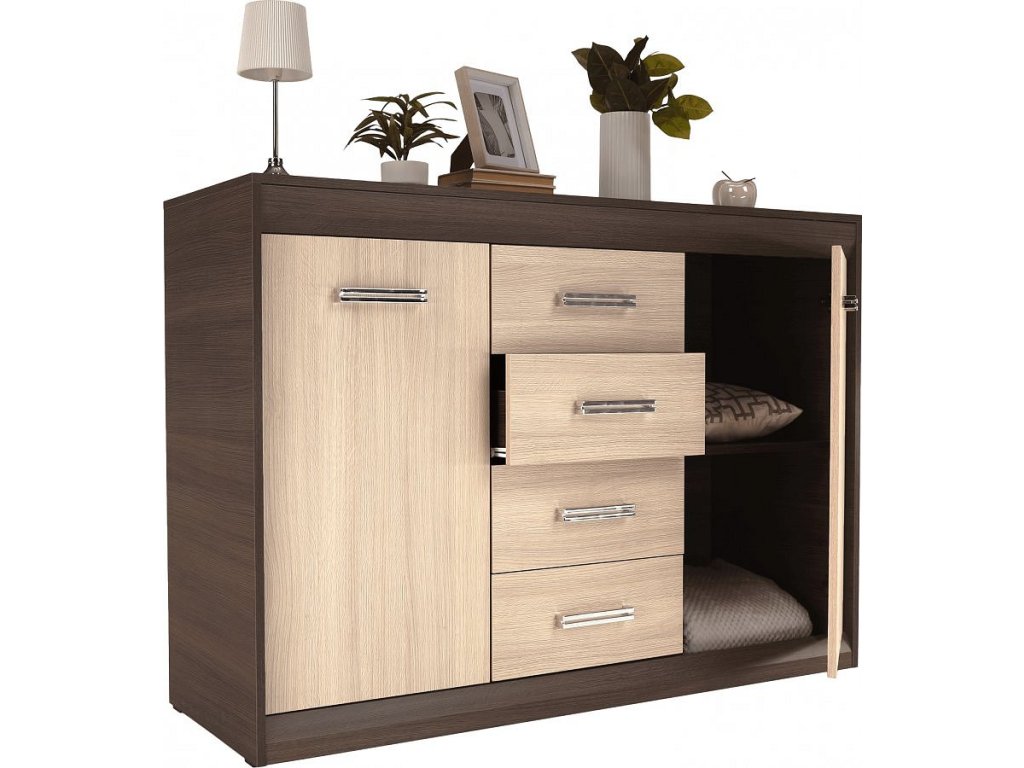 Prosklená moderní komoda KORINA v kombinaci dekoru dub tmavý/dub jasný. Má dostatek úložného prostoru a je vhodná do každého interiéru. Skvěle se hodí k obývací stěně KORINA ve stejném designu. Tloušťka použitého materiálu 16 mm. Dodáváme v demontovaném stavu.