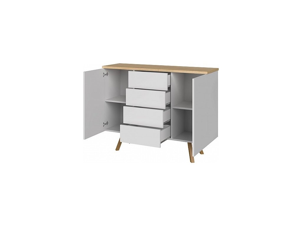 Komoda LIMA 115 2D4Z je ideálním řešením pro ukládání věcí s moderním vzhledem. S rozměry 115 × 87 × 35,5 cm poskytuje dostatek úložného prostoru, který zahrnuje 2 dvířka a 4 prostorné zásuvky. Komoda je vyrobena z odolného lamina v kombinaci dekoru wotan a bílého lesku, což jí dodává elegantní a současný vzhled. Nožky o výšce 25 cm umožňují snadný úklid pod komodou a zajišťují stabilitu nábytku. Tato komoda je praktickým i designovým doplňkem, který se hodí do různých typů interiérů.