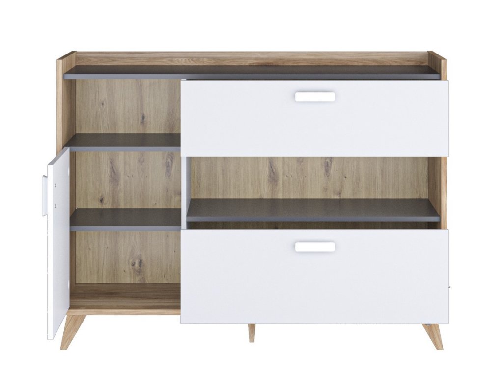 CASA 73036 Komoda jednodveřová se dvěma zásuvkami v moderním stylu a geometrických tvarech. Nábytek je vyroben z desky LTD hraněné páskou ABS, korpus je v barvě dub castello medový, dvířka jsou v barvě bílá alpská, zásuvky jsou v šedé barvě. Zatížení polic max. 5 kg. Nožky mají netradiční zkosený tvar. Dodáváme v demontovaném stavu.
