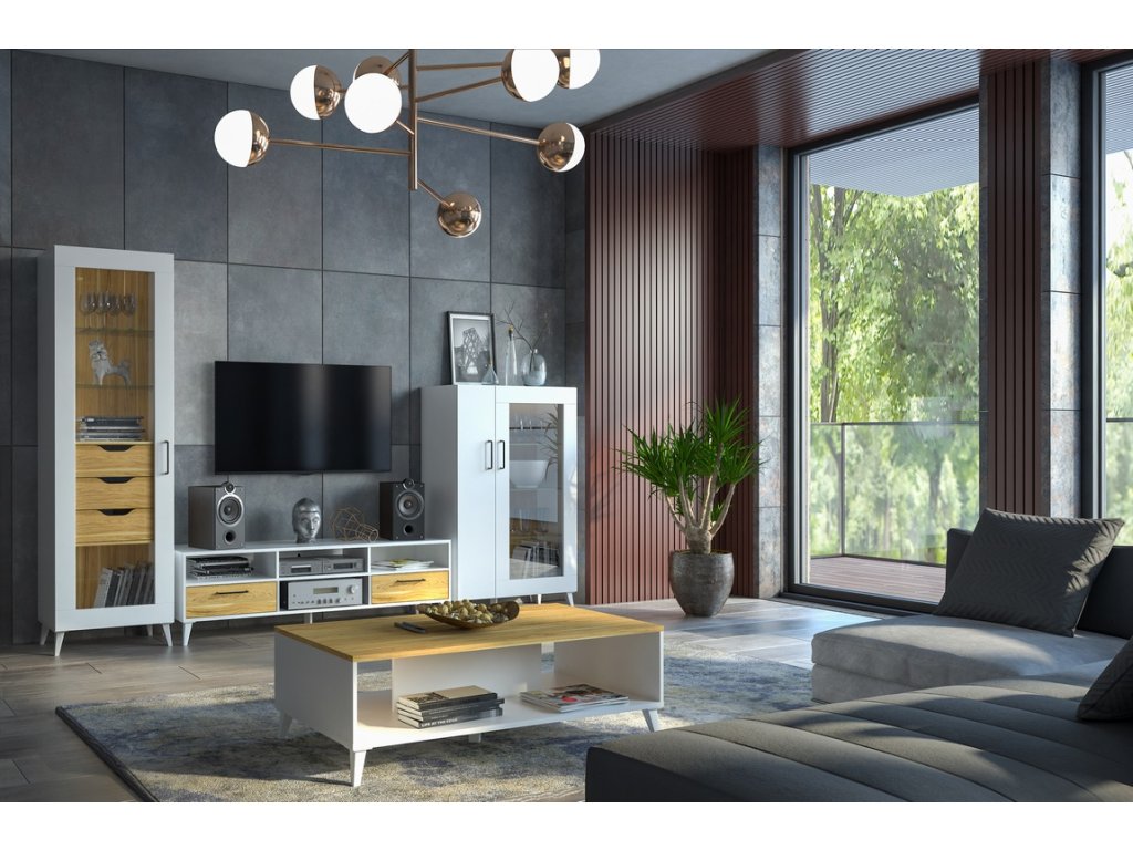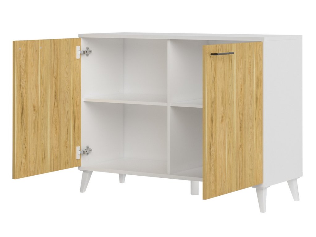 Retro dvoudveřová komoda ze sektorové sestavy PIRASTU . Celá kolekce je vyrobena z kvalitního lamina v barevném dekoru bílá v kombinaci ořech americký. Nohy nábytku jsou z odolného plastu v bílé barvě. Úchyty jsou kovové v černé barvě zakončené zlatými prvky. Komoda se skvěle hodí k obývací sestavě PIRASTU ve stejném designu. Dodáváme v demontovaném stavu. CASA 75095