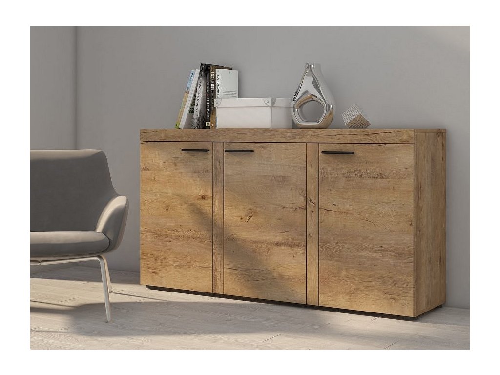 CASA 87008 Komoda třfídveřová v moderním provedení. Korpus i dvířka jsou vyrobeny z kvalitního lamina v barvě dub lefkas. Úchyty jsou plastové černé. Dodáváme v demontovaném stavu.
