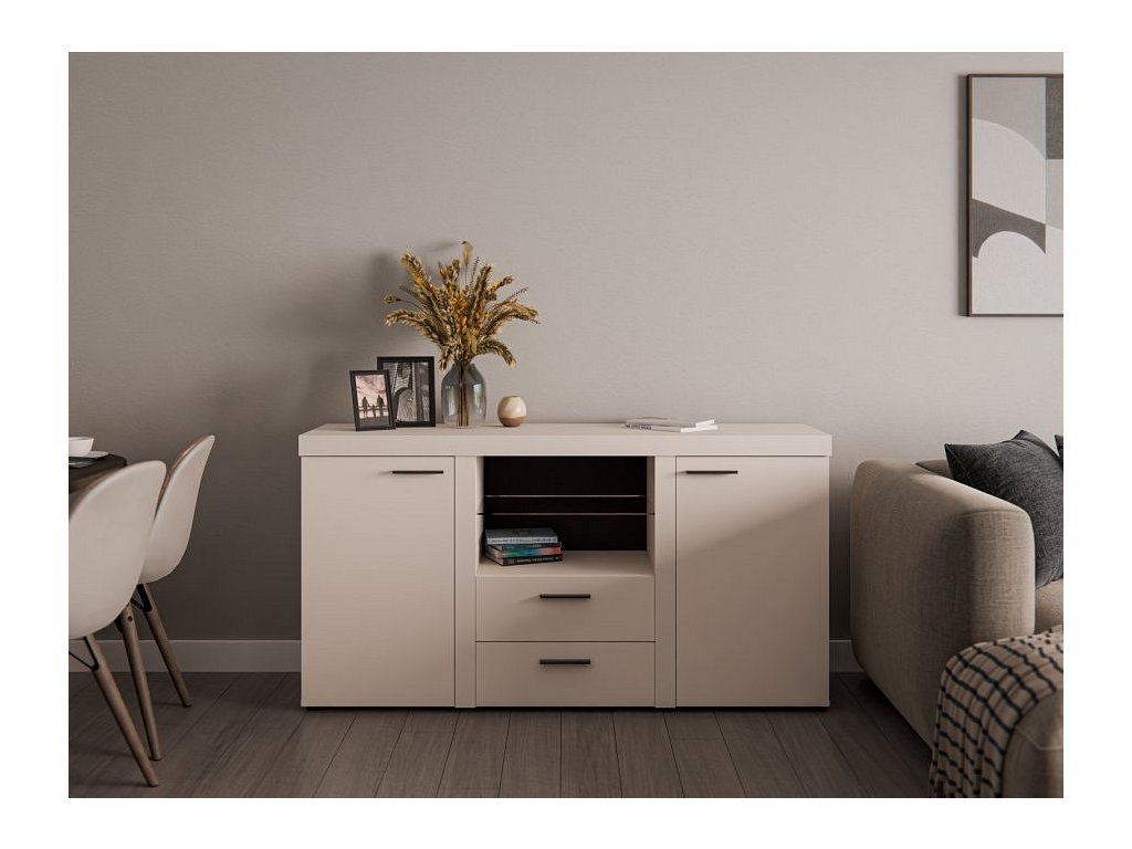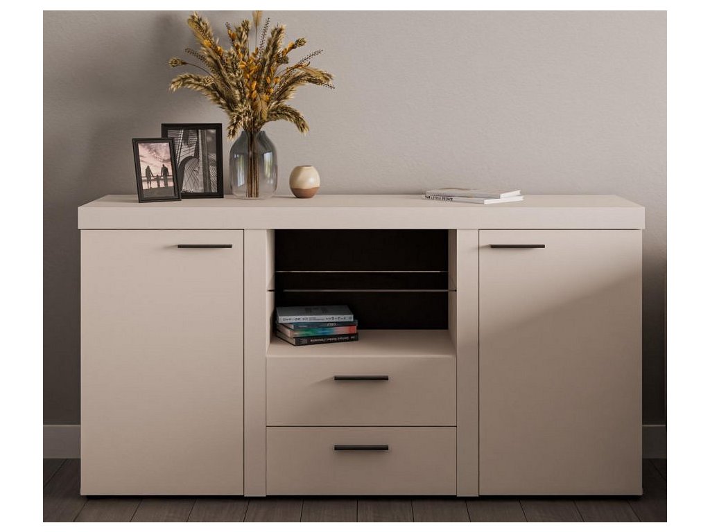 Komoda Rizo je nejen skvělým doplňkem k bytové stěně Rizo. Stejně výborně poslouží jako samostatný kus nábytku. Komoda má univerzální využití a nabízí dostatek úložného prostoru. Komoda je vyrobena z odolného a stálobarevného lamina. Komoda je dodávaná v demontu. Součástí balení je schematický montážní návod, včetně všech potřebných spojovacích prvků. Vyobrazené doplňky, LED osvětlení a dekorace nejsou v ceně.