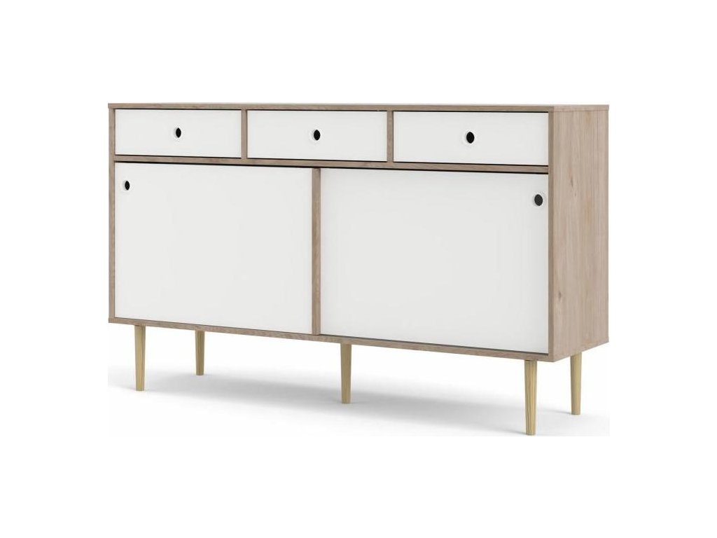 Retro komoda RUBY 2D3S v dekoru hiskory v kombinaci s bílou. Nábytek je vyroben z kvalitního lamina, které je odolné a snadné na údržbu. Retro vzhled zdůrazňují vysoké nožky, kulaté výřezy místo úchytek a posuvná dvířka. Díky svému uspořádání poskytuje dostatek úložného prostoru. Komodu je možné doplnit o další komponenty z řady RUBY ve stejném dekoru. Nabízíme ve dvou barevných provedeních. Dodáváme v demontovaném stavu. Vlivem nastavení monitorů, nebo displejů telefonů, se zobrazení barev na fotografii může od skutečnosti lišit.