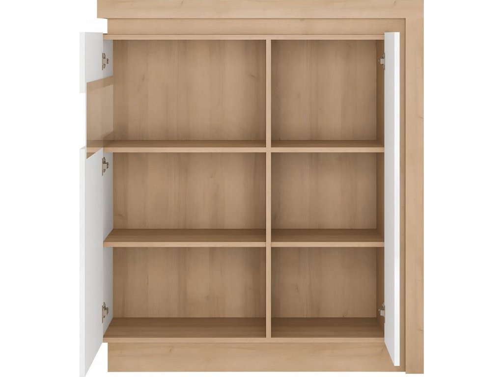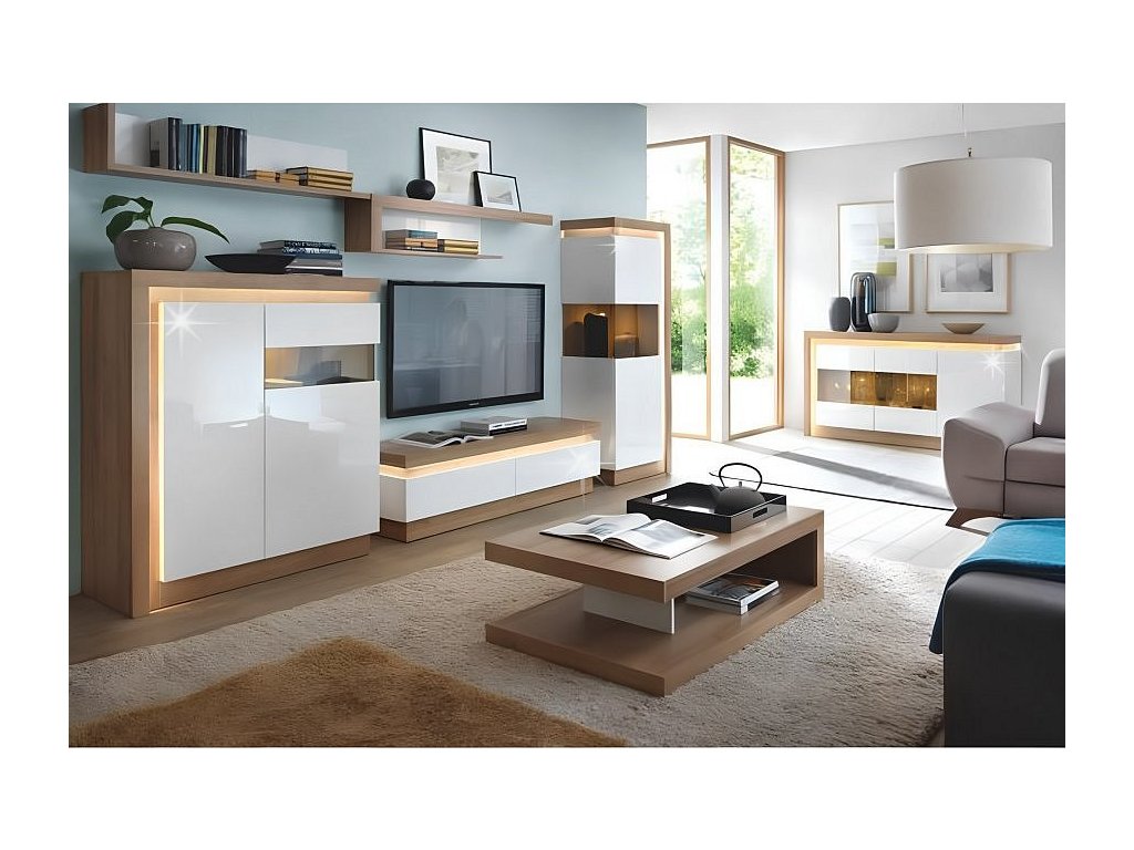 Komoda z luxusní sestavy LEONARDO LYOV04L v dekoru dub riviera v kombinaci s bílým leskem. Částečně prosklená, vitrína je odolná vůči poškrábání a vlhkosti. Je vhodná do obývacích pokojů i jídelen. Má systém tichého dovírání dvířek. Tloušťka použitého materiálu DTD 16 mm. Komodu je možné doplnit o další komponenty z řady LEONARDO ve stejném designu. Dodáváme v demontovaném stavu.