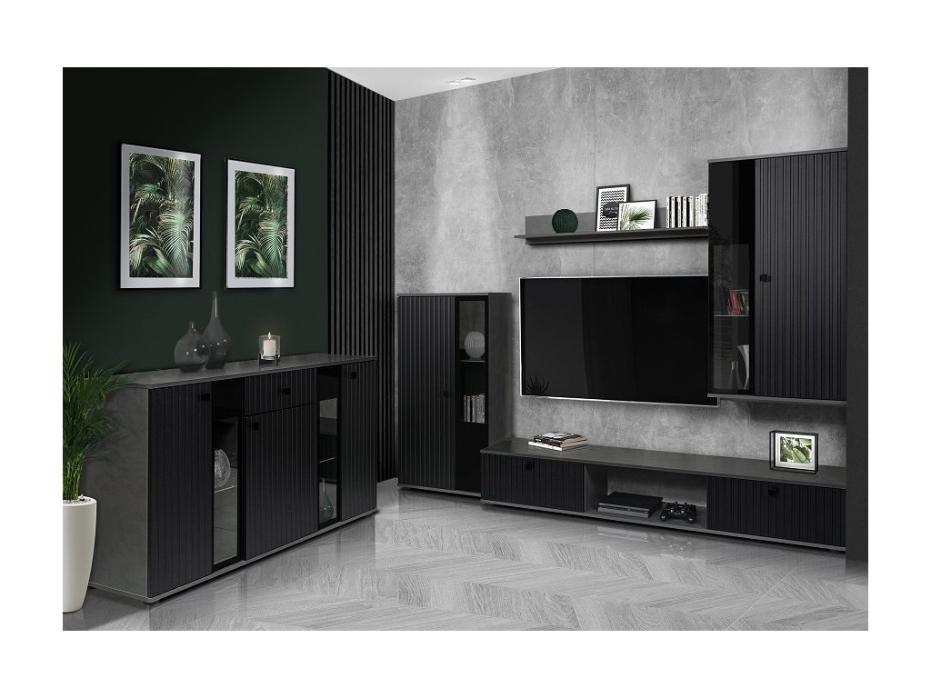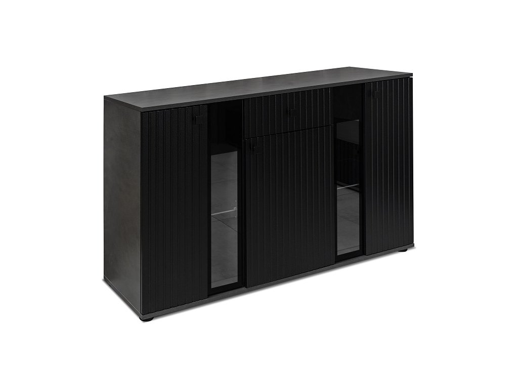 CASA 87009 Komoda v moderním stylu. Komoda je částečně prosklená, má 3 dvířka a 1 praktickou zásuvku. Barevné provedení černá/matera. Tato komoda krásně doplní obývací stěnu, kterou rovněž najdete v naší nabídce. Nábytek je vyroben z kvalitního lamina. Přední část komody je vyrobena z kvalitní MDF desky tloušťky 16 mm. Korpus je z LTD desky, tloušťka 15 mm. Sklo ve vitríně je čiré. Dodáváme v demontovaném stavu.