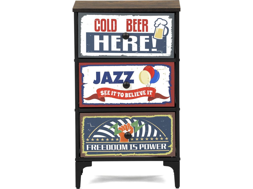 Retro komoda značky Autronic přinese do vašeho interiéru jedinečný styl a originalitu. Textilní čela zásuvek s výplní HDF a vintage potiskem navozují atmosféru starých amerických barů a jazzových klubů. Kombinace černé kovové konstrukce, desky v dekoru starého dřeva a zdobných noh dodává nábytku robustní, ale zároveň elegantní vzhled. Korpus zásuvek je vyroben z netkané textilie s výplní HDF, což zajišťuje jejich lehkost a snadnou manipulaci. Ideální doplněk do obývacího pokoje nebo stylové kavárny, kde se stane nepřehlédnutelným prvkem.