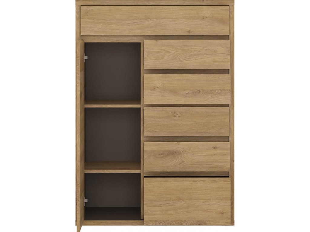 Komoda TYP 32 z elegantní kolekce SHELDON. Tento nábytek vás okouzlí krásným moderním stylem s minimalistickým přístupem k designu. Je vyrobena z laminované DTD odolné vůči poškrábání, UV záření či vysokým teplotám. Tloušťka použitého materiálu u korpusu 2,8 cm Celá kolekce je v dekoru dub shetland. Komoda disponuje 6 zásuvkami a skříňkou. Nabízí tak dostatek úložného prostoru. Doporučujeme přikoupit další komponenty ze sestavy SHELDON. Dodáváme v demontu.