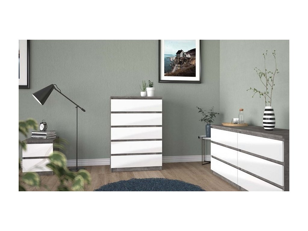 Komoda SIMPLICITY v dekoru beton v kombinaci s bílým leskem, v nadčasovém skandinávském designu. Má rovné a čisté linie, které vytvoří útulný, pohodový a příjemný interiér. Komoda díky svému provedení nabízí univerzální použití, má dostatek úložného prostoru a najde uplatnění v kterékoliv místnosti Vašeho bytu. Komodu je možné doplnit o další komponenty z řady SIMPLICITY ve stejném designu. Je dodávaná v demontu. Součástí je montážní návod včetně všech spojovacích prvků. Vyobrazené dekorace nejsou v ceně.