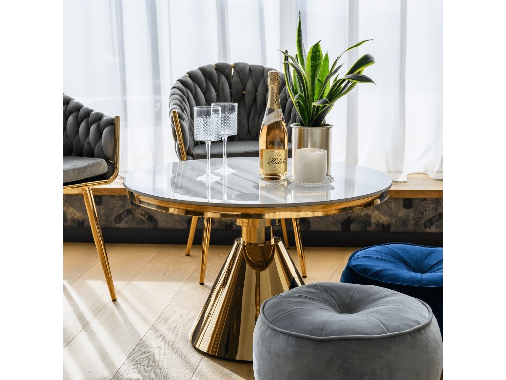 Materiál: kámen/ocel Barva: bílý mramor/zlatá Rozměry (PxV): 80x53 cm Tloušťka kamenného platu: 1,1 cm Nosnost: 50 kg Originální kousek Kulatý Moderní a stylový Dodáváno v demontu