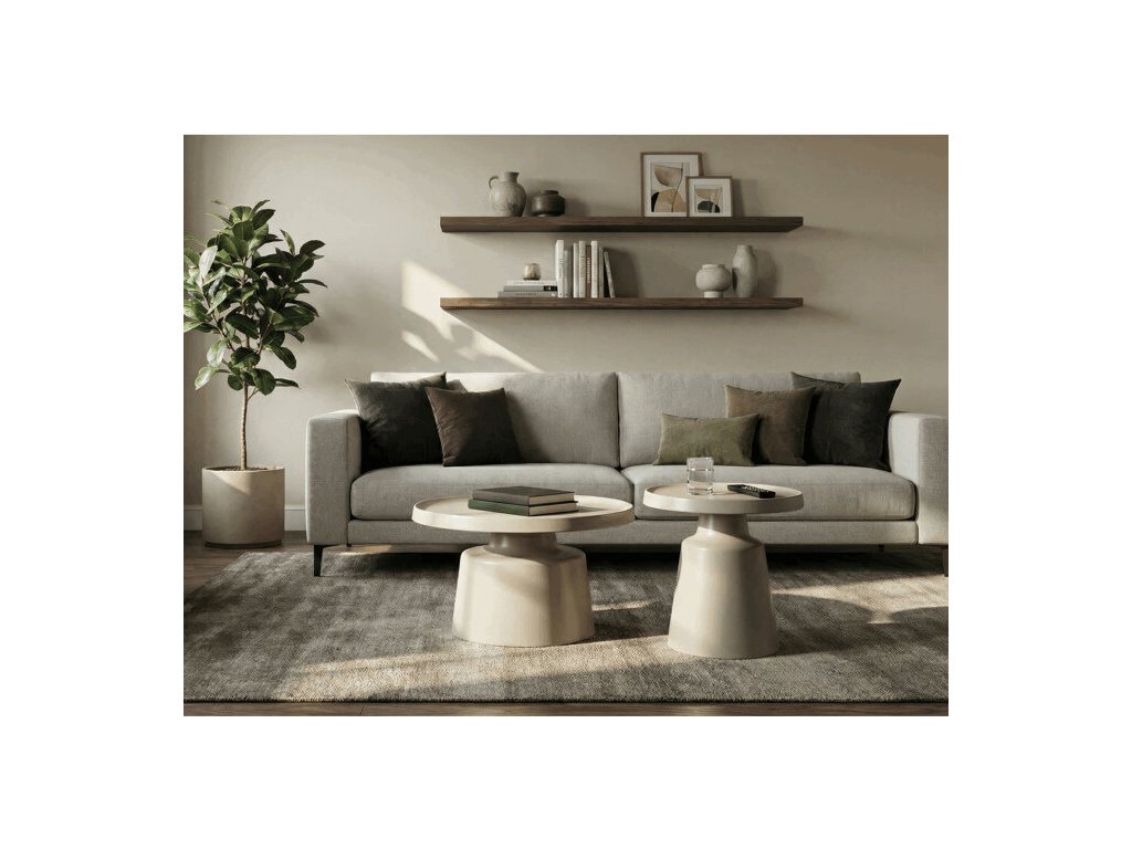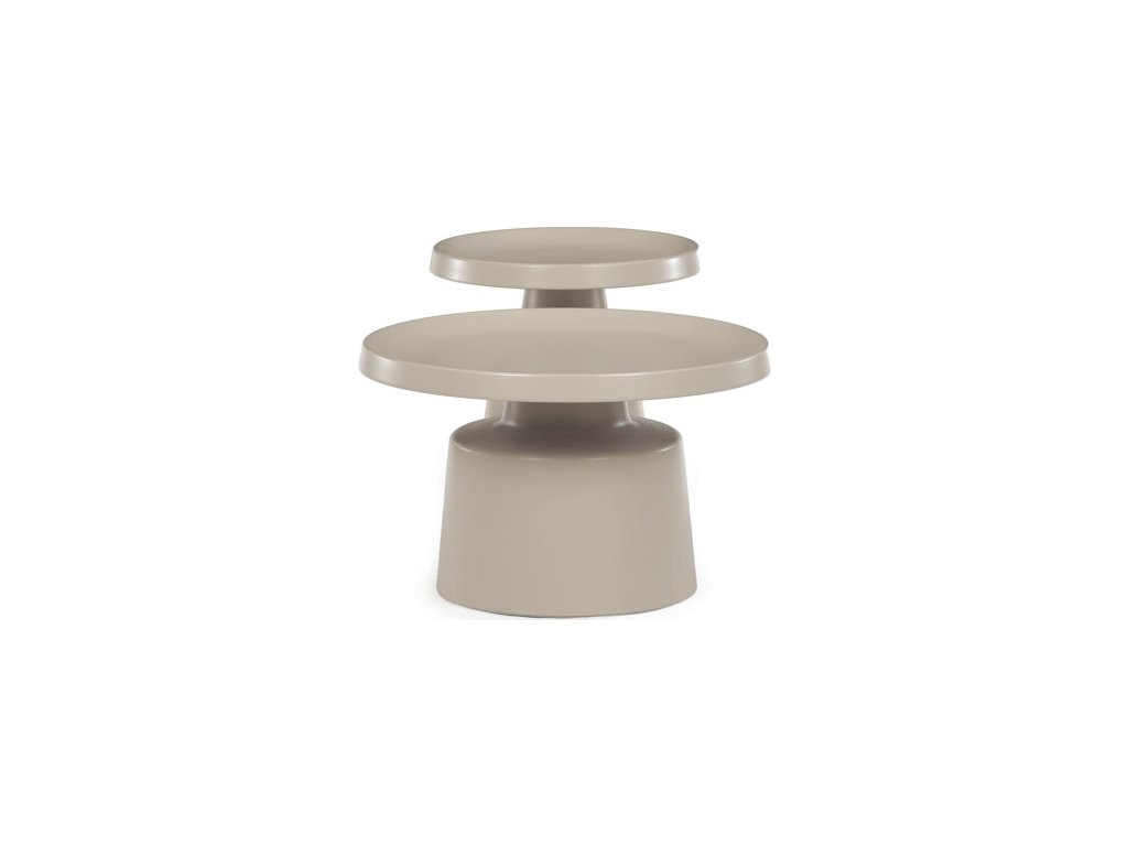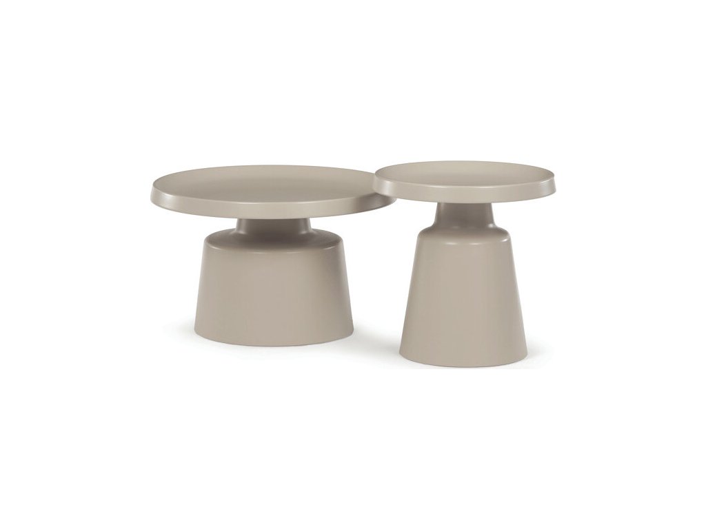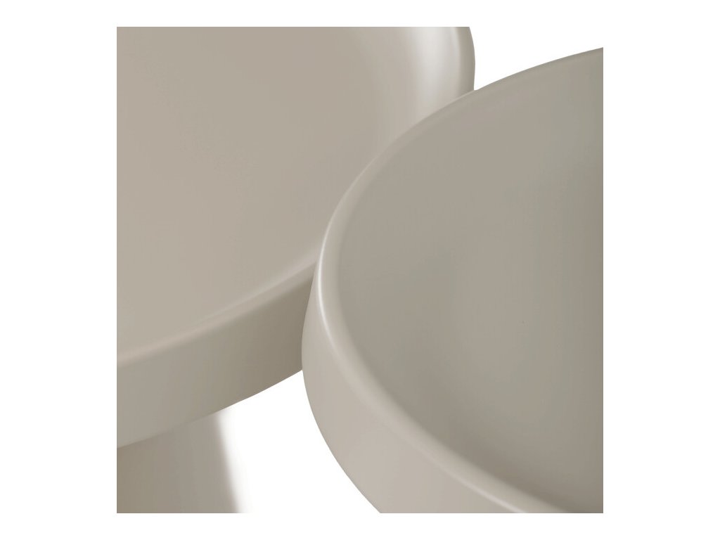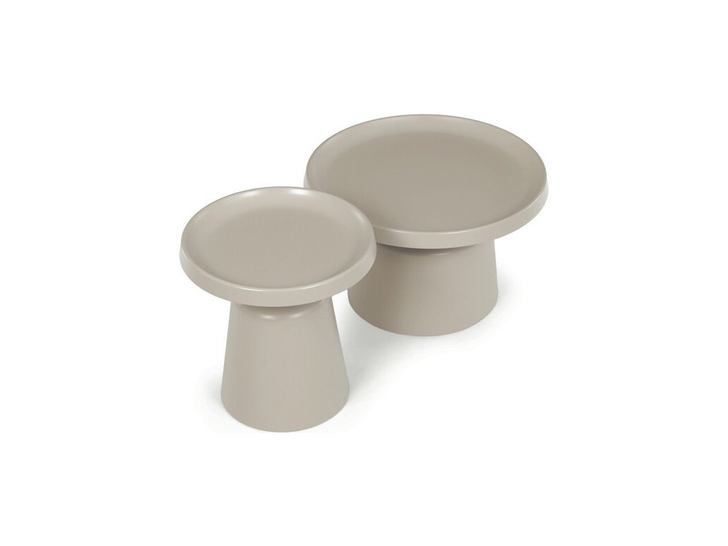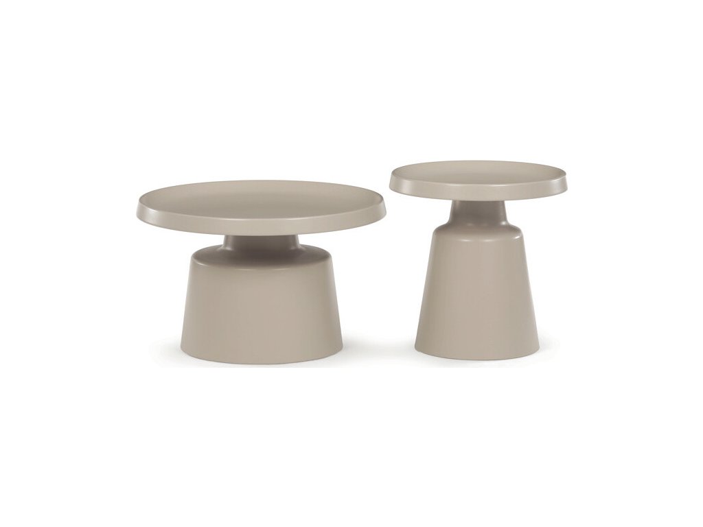 Sada dvou konferenčních stolů v béžovém matném provedení nabízí kombinaci funkčnosti a moderního designu. Obě desky i nohy jsou vyrobeny z kovu, což zajišťuje stabilitu a pevnost stolů. Stolky mají dekorativní hranu, která dodává jemný designový detail, a jejich povrch je snadno udržovatelný a odolný vůči běžnému opotřebení. Větší stůl má průměr 68,5 cm a výšku 43 cm, menší stůl průměr 49 cm a výšku 50,5 cm, což umožňuje variabilní uspořádání v prostoru. Díky svému neutrálnímu odstínu béžové barvy se hodí do různých interiérů.