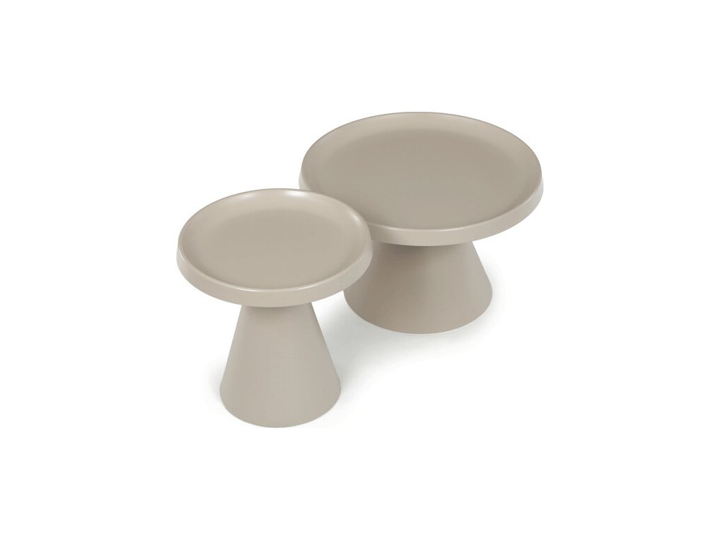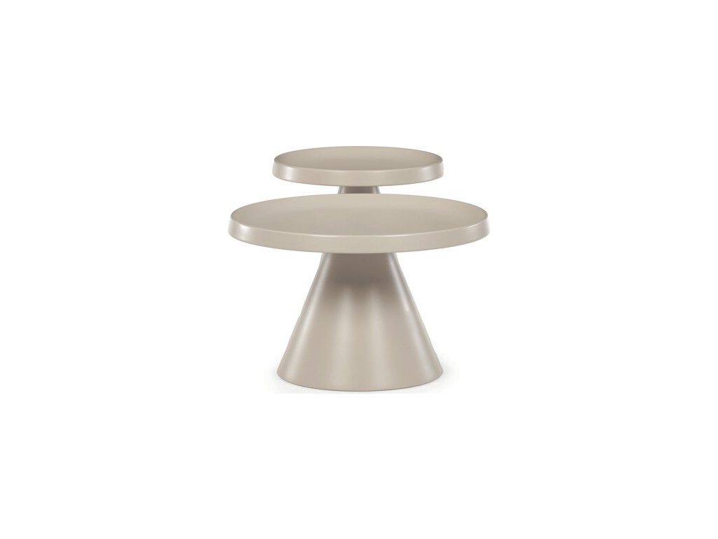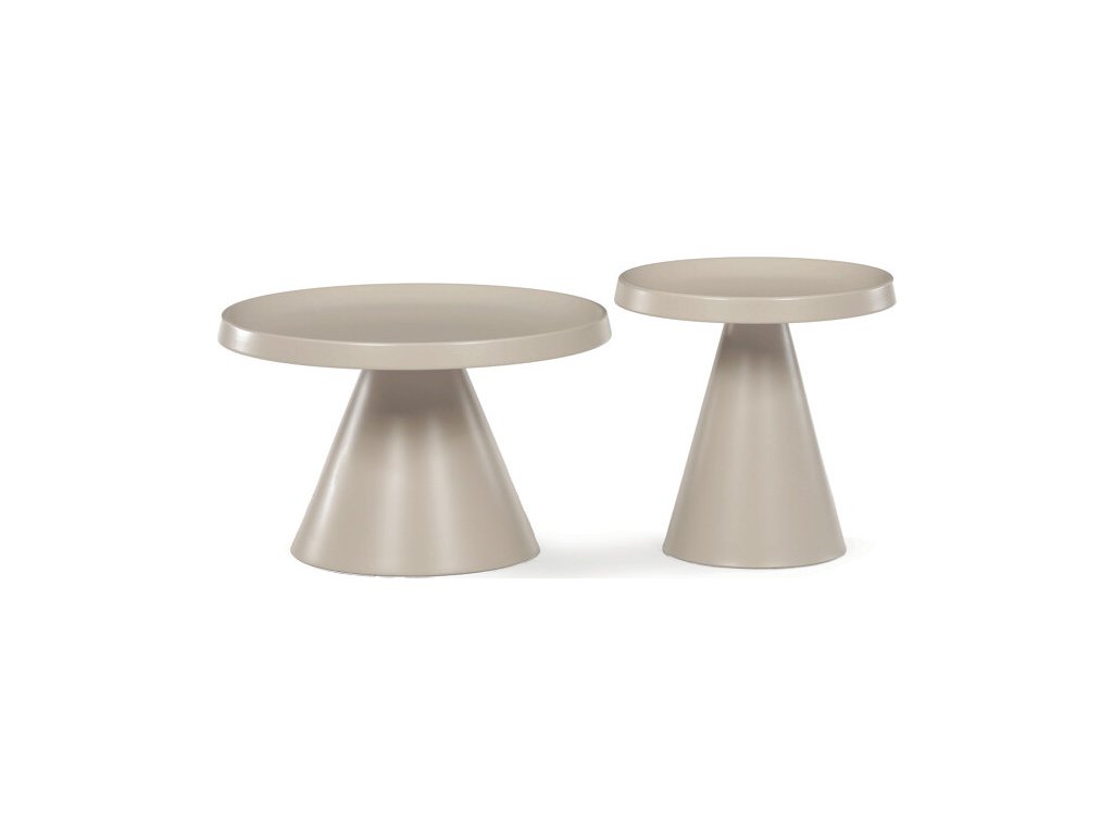 Sada dvou konferenčních stolů v béžovém matném provedení nabízí kombinaci funkčnosti a moderního designu. Obě desky i nohy jsou vyrobeny z kovu, což zajišťuje stabilitu a dlouhou životnost, přičemž povrchová úprava usnadňuje údržbu. Větší stůl má průměr 68,5 cm a výšku 43,5 cm, menší pak průměr 49 cm a výšku 49,5 cm, což umožňuje variabilní uspořádání v prostoru. Dekorativní hrany desek podtrhují jednoduchý a čistý vzhled, který se hodí do moderních interiérů. Pevná kovová podnož zaručuje stabilitu při běžném používání.