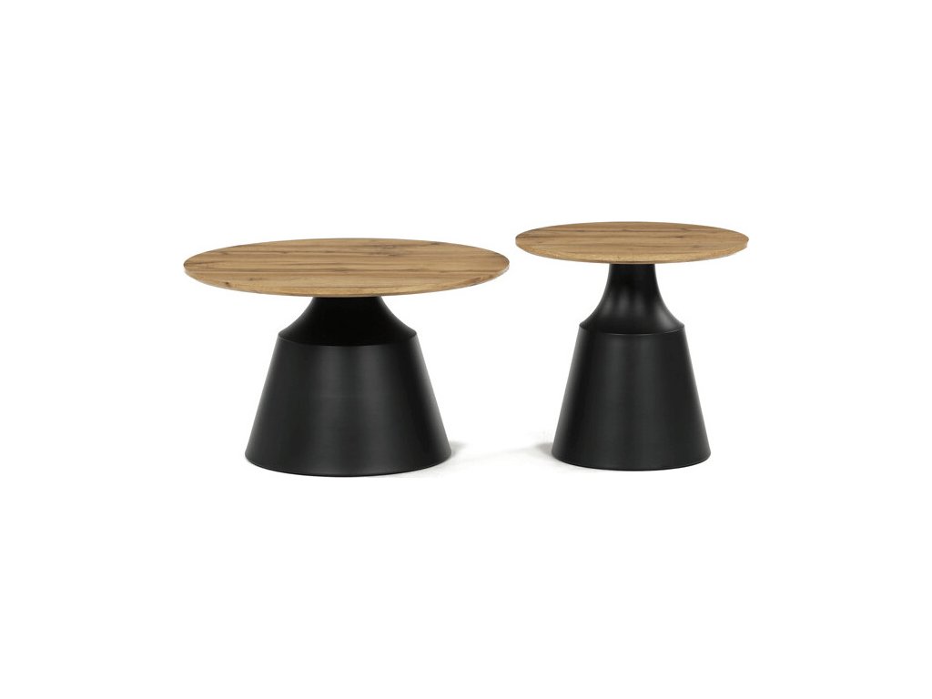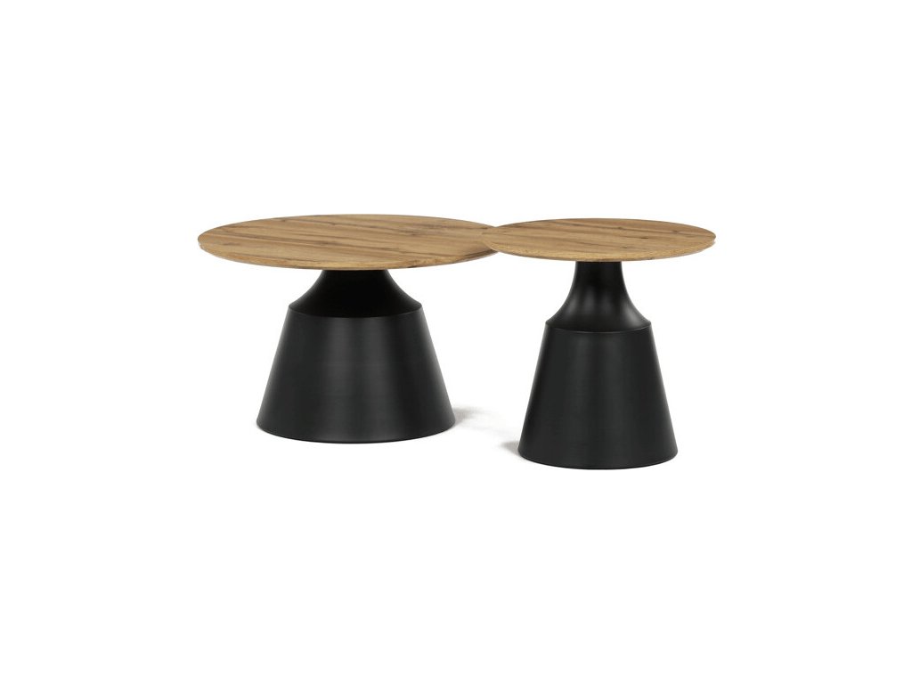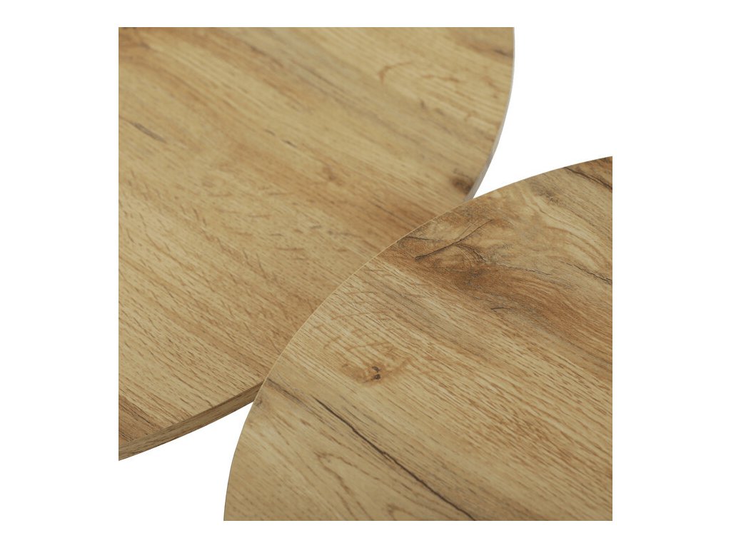 Sada dvou konferenčních stolů kombinuje desky z MDF s dekorativním povrchem v odstínu dub artisan a stabilní kovové podnože v černé barvě. Desky mají matnou úpravu, která usnadňuje údržbu a zajišťuje dlouhodobou odolnost proti běžnému opotřebení. Větší stůl má průměr 70 cm a výšku 42,5 cm, menší pak průměr 50 cm a výšku 47,5 cm, což umožňuje variabilní uspořádání v prostoru. Kovová podnož je navržena pro pevnost a stabilitu, čímž zajišťuje bezpečné používání. Moderní design s kontrastem přírodního dekoru a černé barvy se hodí do různých interiérů.