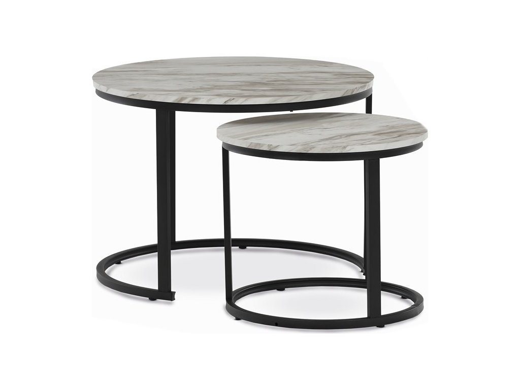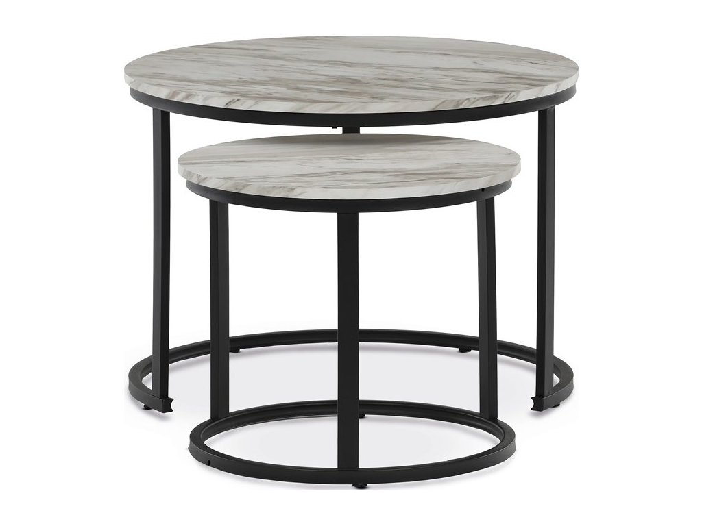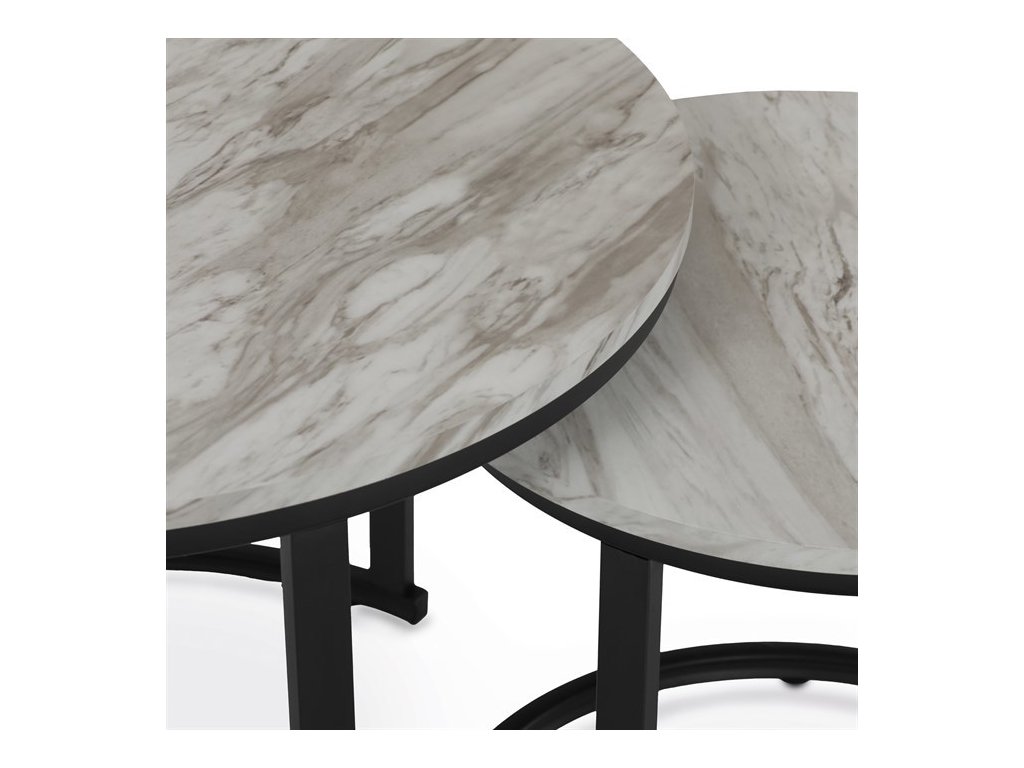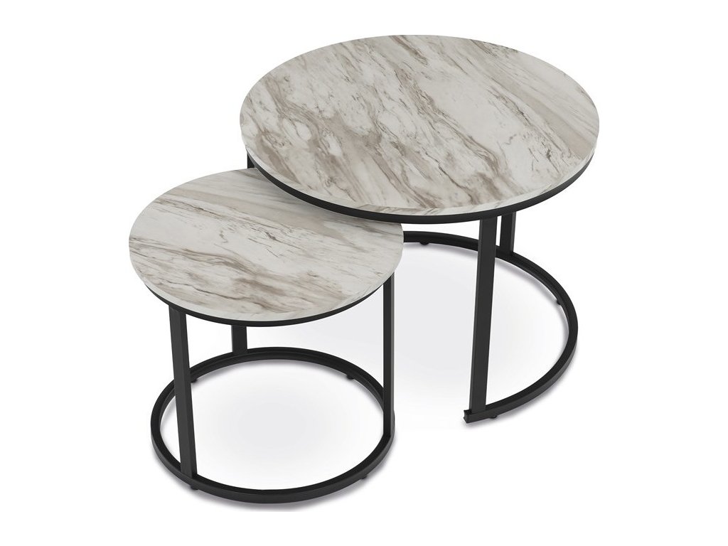 Set dvou konferenčních stolků s deskami z MDF v dekoru bílého mramoru nabízí moderní a praktické řešení pro obývací pokoj. Desky jsou opatřeny matnou povrchovou úpravou, která usnadňuje údržbu a zachovává přirozený vzhled mramorového dekoru. Podnože jsou vyrobeny z pevného kovu s černým lakem, který zajišťuje stabilitu a dlouhou životnost. Menší stolek lze zasunout pod větší, což umožňuje flexibilní využití prostoru. Výška většího stolku je 50 cm, což je ideální rozměr pro pohodlné odkládání nápojů či dekorací.