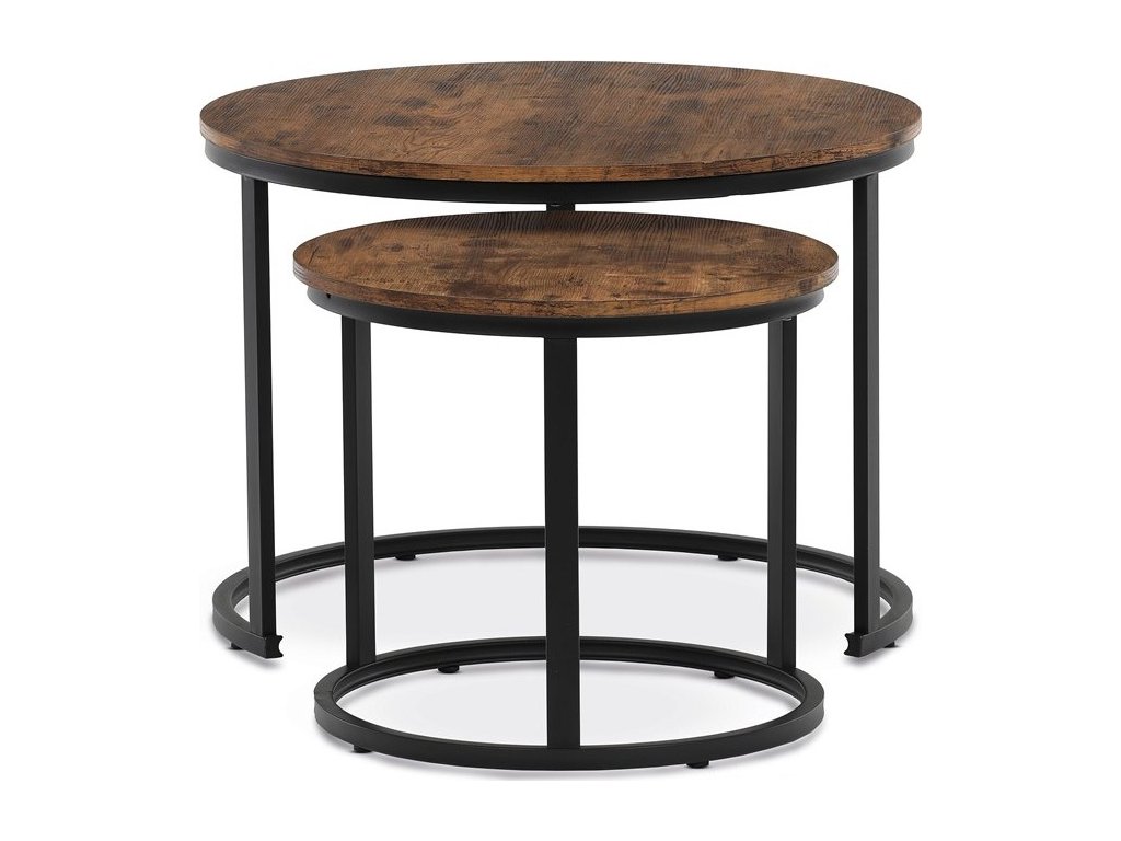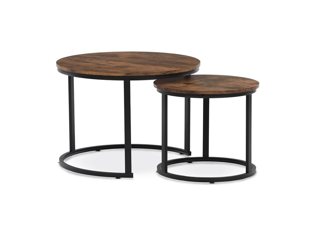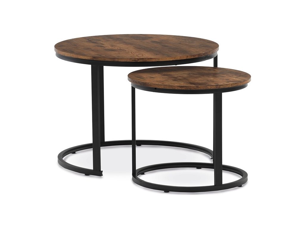 Set dvou konferenčních stolků kombinuje desky z MDF s dekorem starého dřeva a pevnou kovovou podnož v černém matném laku. Kulaté desky o hnědém odstínu s texturou připomínající přírodní dřevo vytvářejí příjemný vizuální efekt, který doplňuje minimalistická kovová podnož s kruhovým tvarem. Výška většího stolku je 50 cm, což zajišťuje pohodlné využití v obývacím prostoru. Stolky jsou navrženy tak, aby se daly snadno kombinovat a prostorově efektivně uspořádat, přičemž pevná kovová podnož zaručuje stabilitu a dlouhou životnost. Matný povrch desek se snadno udržuje a odolává běžnému opotřebení.