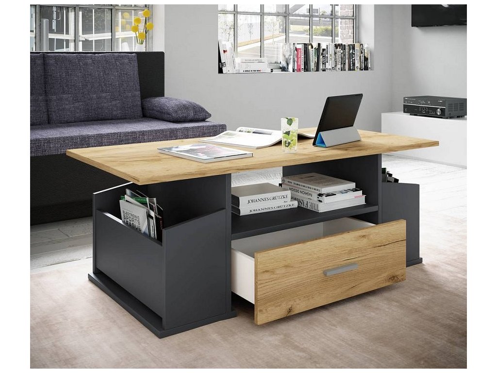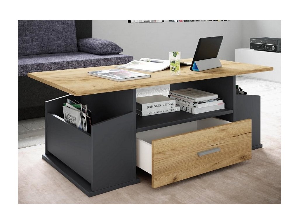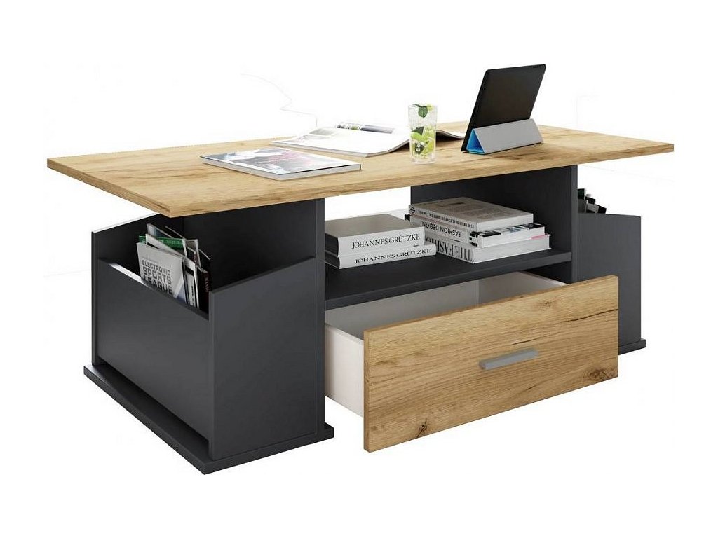 Konferenční stolek Junata je praktický stolek do obýváku, který se díky svému univerzálnímu designu hodí téměř do každého interiéru. Jako odkládací stolek nabízí dvě otevřené boční přihrádky a jednu prostornou zásuvku, kam lze uložit knihy, časopisy nebo drobné předměty, které chcete mít vždy po ruce.
