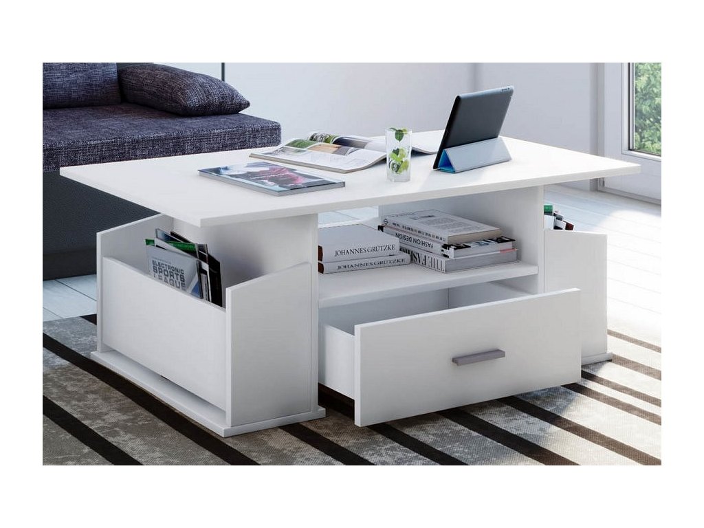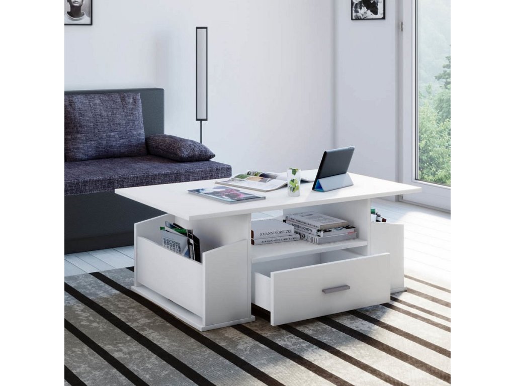 Tento originální konferenční stolek Junata může být univerzálním kusem nábytku pro téměř každý obývací pokoj. Dvě boční přihrádky a jedna velká zásuvka poskytne dostatek úložného prostoru.