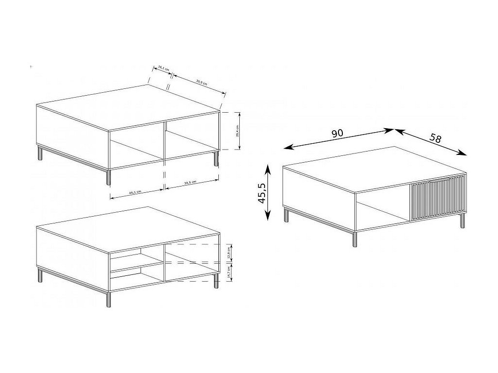 Nábytek je zdoben vzorem na čelních stranách v podobě frézovaných drážek. Všechny kusy nábytku z této kolekce stojí na černých kovových nožkách. Jednoduché a funkční tvary se hodí do obývacího pokoje, ložnice i jídelny.