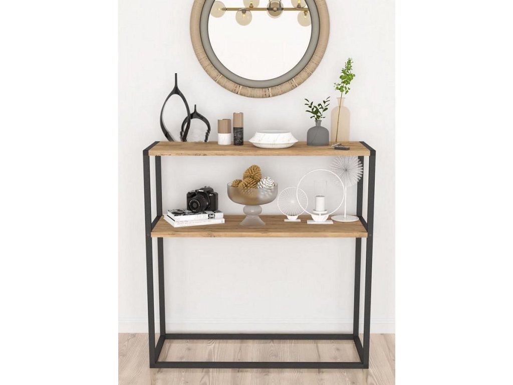 CASA 36016 Konzolový stolek - regál je z kovového rámu v matné černé barvě a odkládací deska je vyrobena z kvalitní LTD desky. Barevné provedení odkládací desky je borovice. Dodáváme v demontovaném stavu.