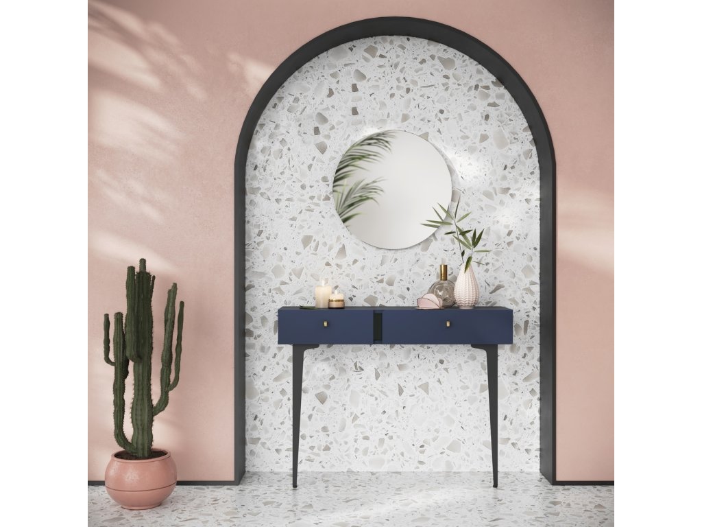 Konzolový stolek se dvěmi zásuvkami. Zásuvky mají soft close - systém tichého dovírání. Kolekce moderních komod a toaletních stolků je určena pro ty, kteří milují barevné prostory, ale také pro ty, kteří dávají přednost vnesení barvy do interiéru pomocí jednoho výrazného prvku. Není žádným tajemstvím, že barva v interiéru hraje obrovskou, téměř klíčovou roli. Její výběr ovlivňuje nejen celkový vzhled místnosti, ale především naši náladu. Rozměry viz obrázek. Barevné provedení - tmavě modrá granát, úchyty jsou tvarované zlaté. Stolek neobsahuje zrcadlo v ceně, doporučujeme dokoupit. Dodáváme v demontovaném stavu.