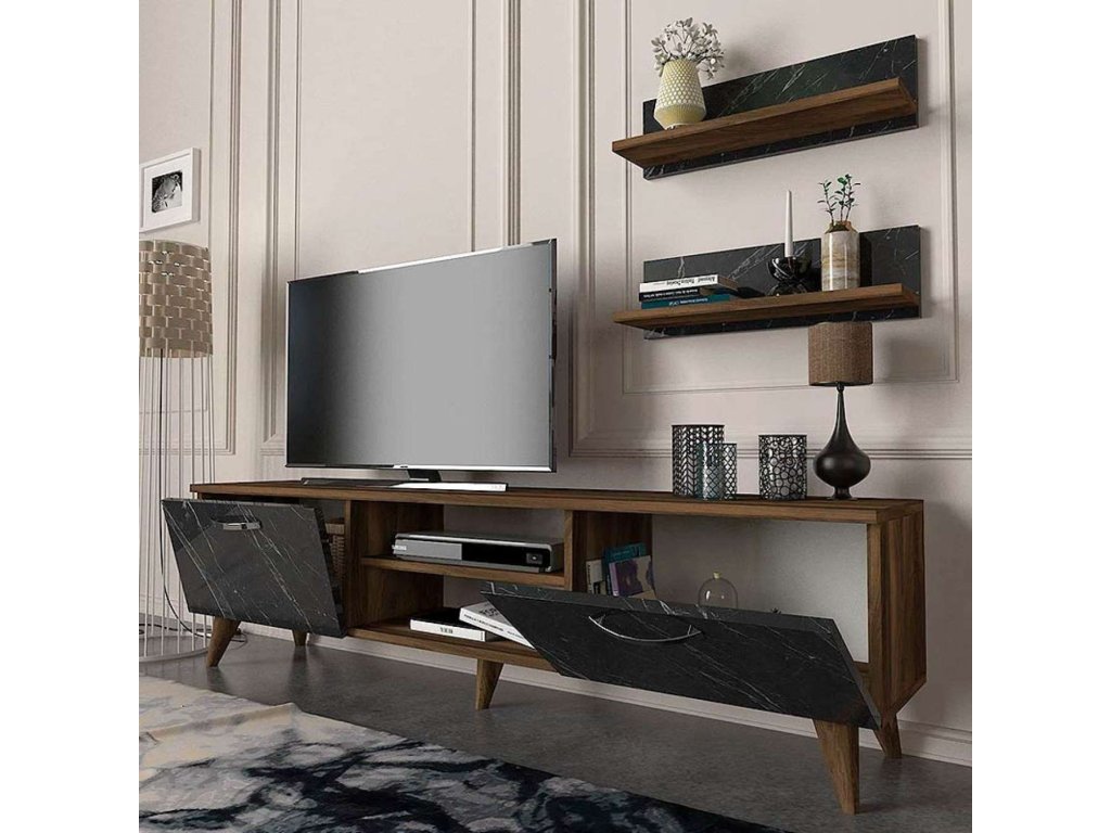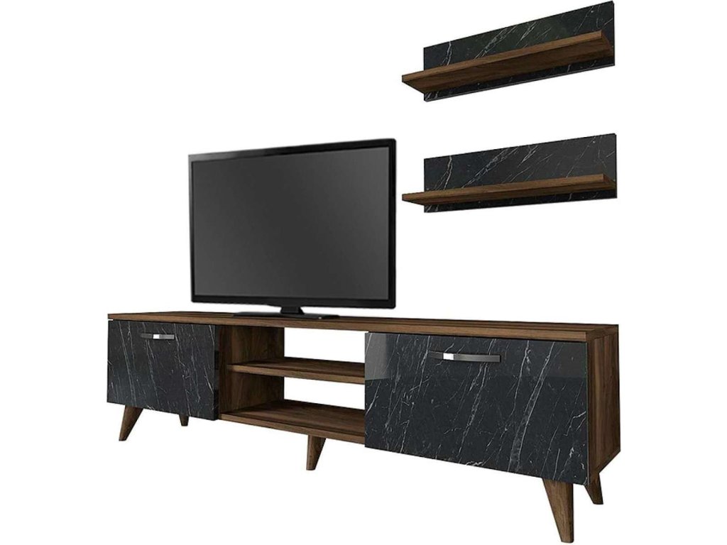 - Sestava obsahuje: TV stolek a dvě nástěnné police, nabízející optimální kombinaci úložného prostoru a dekorativní funkčnosti.