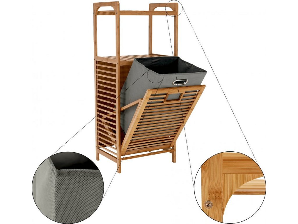 Materiál: bambus lakovaný / látka Barva: přírodní / šedá Rozměry (ŠxHxV): 40x30x95 cm Vnitřní rozměry (ŠxHxV): 40x25x50 cm Vyjímatelné látkové pytel Doporučujeme čistým vlhkým hadříkem Nosnost: 20 kg Dodávané v demonte