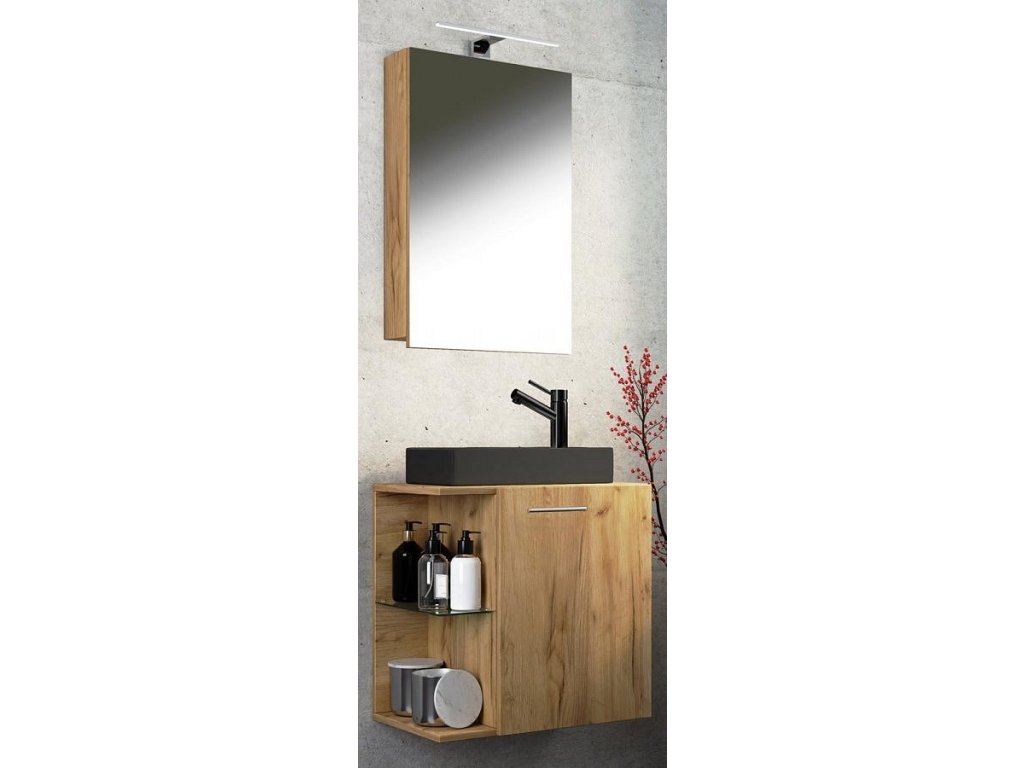 Tento kompaktní set kombinuje zrcadlovou skříňku, keramické koupelnové umyvadlo a umyvadlovou skříňku s dostatkem úložného prostoru pro každodenní potřeby.