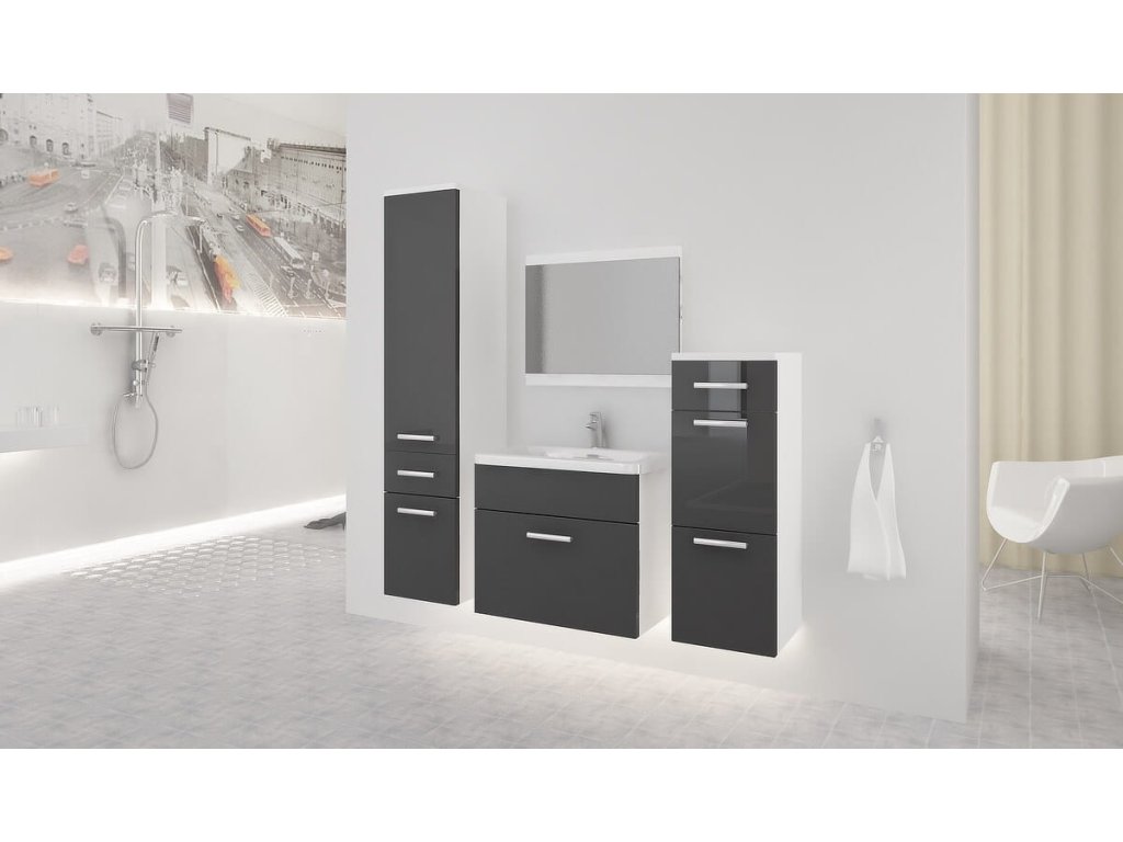Moderní a jednoduchá koupelnová sestava, která splní svůj praktický i dekorativní účel. Sestava se skládá ze dvou závěsných skříněk, zrcadla a skříňky pod umyvadlo včetně umyvadla. Koupelnová sestava má plastové úchyty v šedé barvě. Dvířka jsou vyrobena v lesku z lamina tloušťky 16 mm v šedé barvě, korpusy jsou v bílém provedení MAT tloušťky lamina 18 mm. Zboží je dodáváno v demontu se schematickým návodem k montáži. Vyobrazené dekorace nejsou v ceně sestavy. Sestavu nabízíme také v dalších barevných provedeních, které jsou k vidění na vedlejších fotografiích.