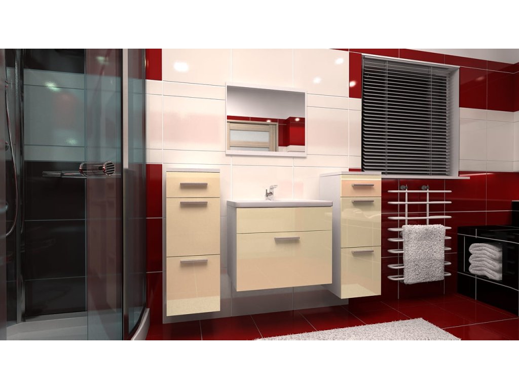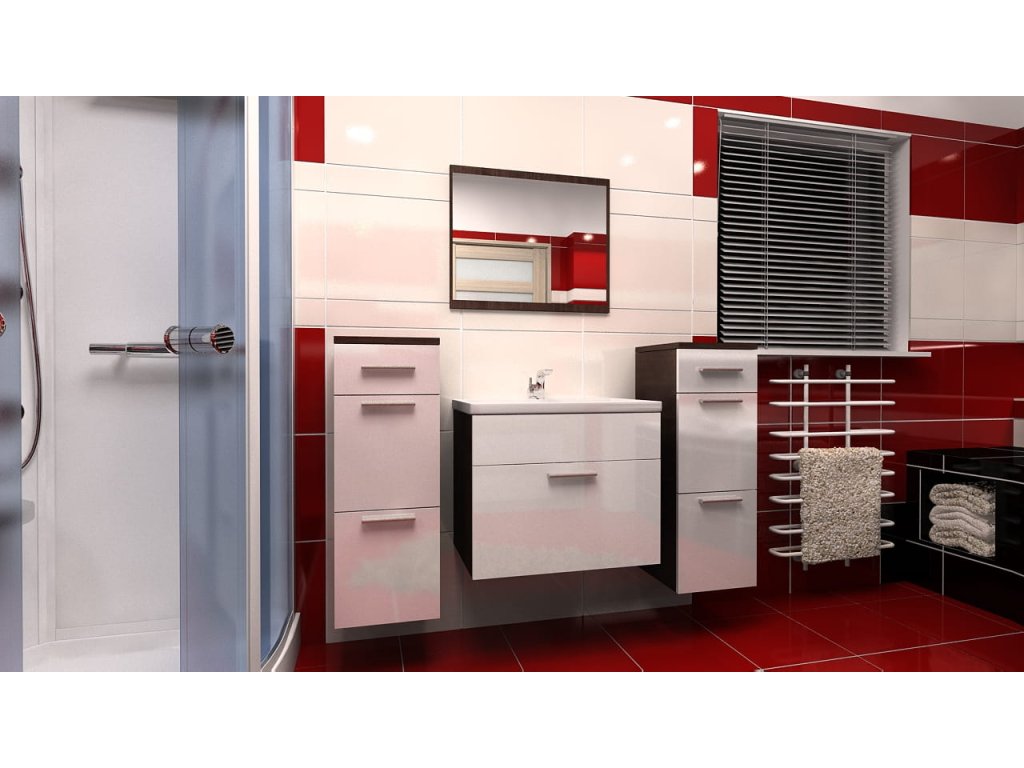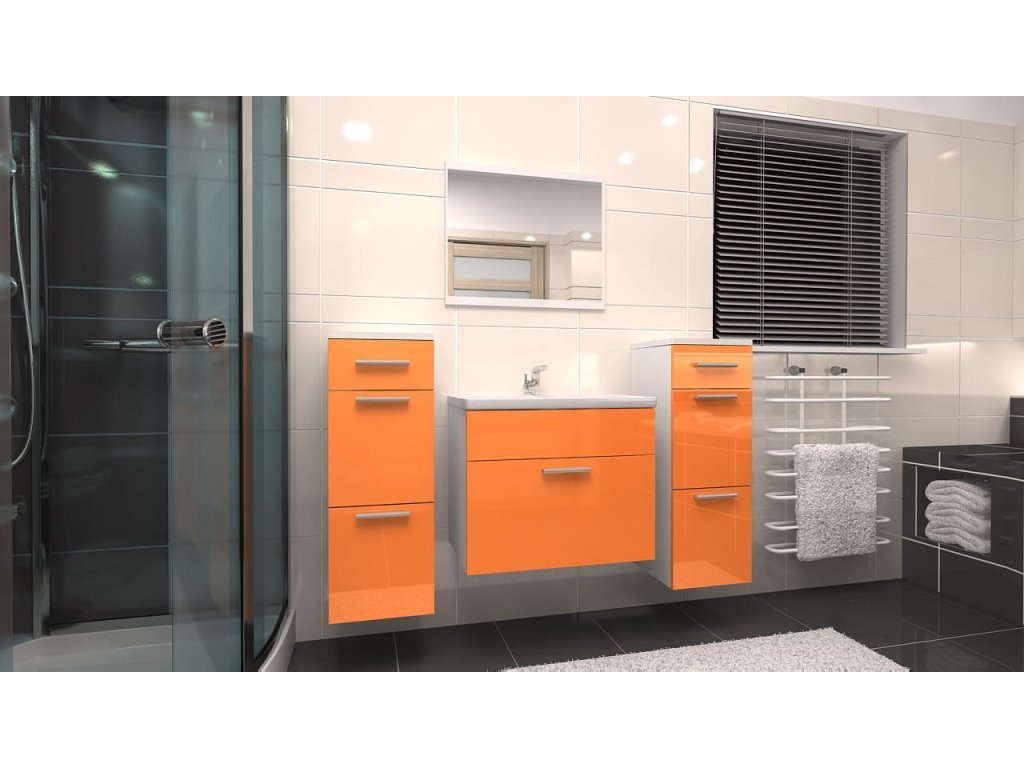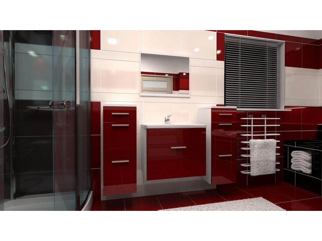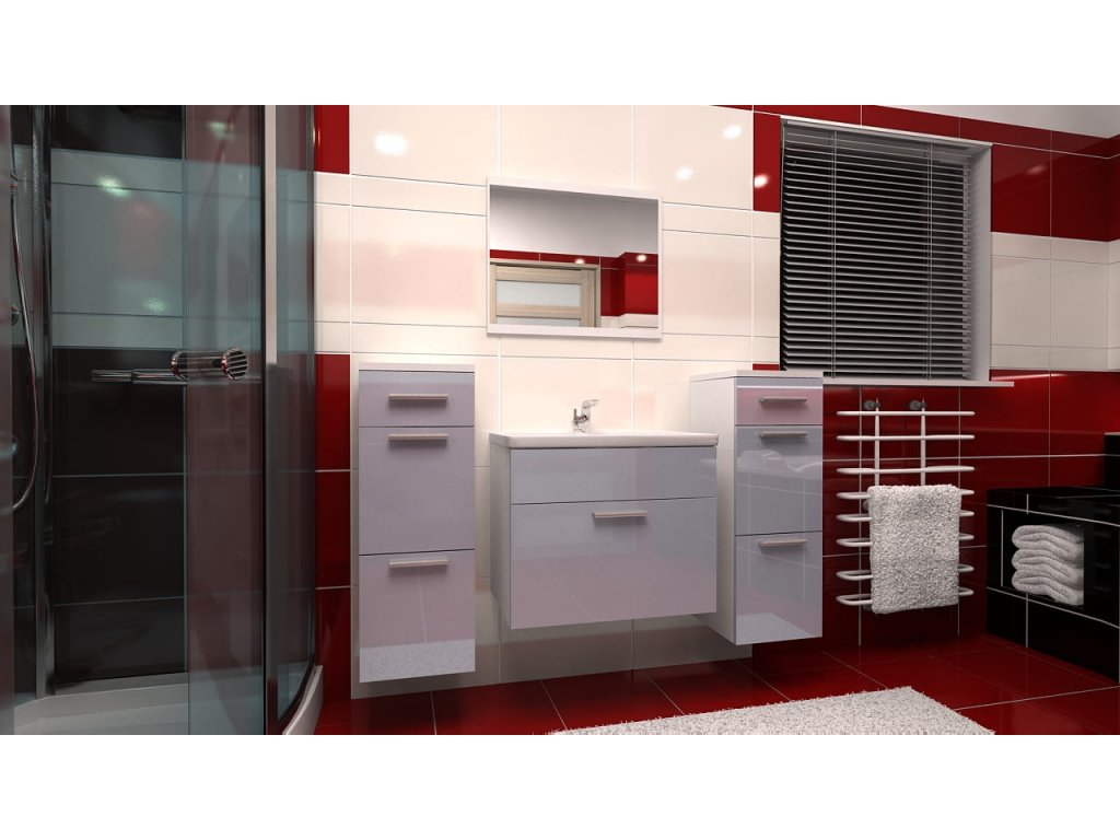 Moderní a jednoduchá koupelnová sestava, která splní svůj praktický i dekorativní účel. Sestava se skládá ze dvou závěsných skříněk, zrcadla a skříňky pod umyvadlo včetně umyvadla. Koupelnová sestava má plastové úchyty v šedé barvě. Dvířka jsou vyrobena v lesku z lamina tloušťky 16 mm ve fialové barvě, korpusy jsou v bílém provedení MAT tloušťky lamina 18 mm. Zboží je dodáváno v demontu se schematickým návodem k montáži. Vyobrazené dekorace nejsou v ceně sestavy. Sestavu nabízíme také v dalších barevných provedeních, které jsou k vidění na vedlejších fotografiích.