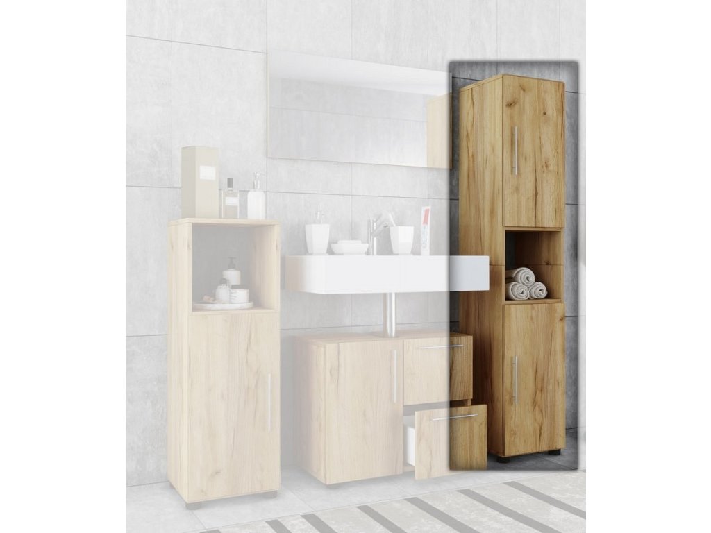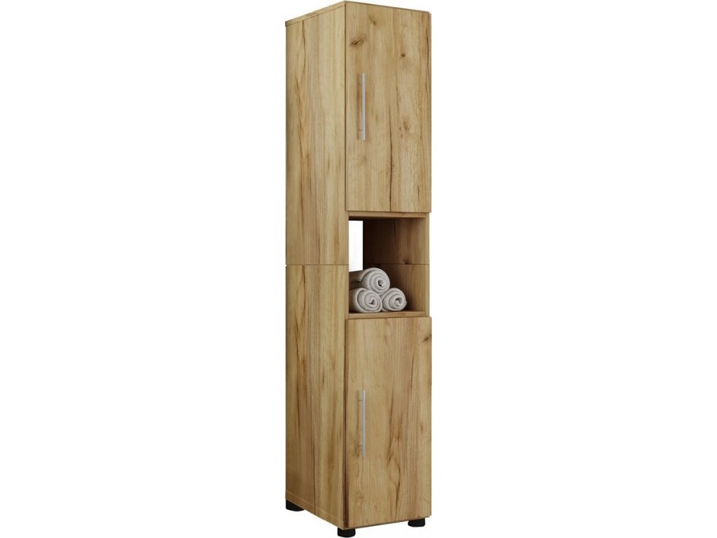 Vysokou koupelnovou skříň v medovém odstínu dubu s dvěma velkými dvířky a otevřenou policí uprostřed můžete využít např. k odložení tělového mléka, ručníků a nejrůznějších koupelnových doplňků.
