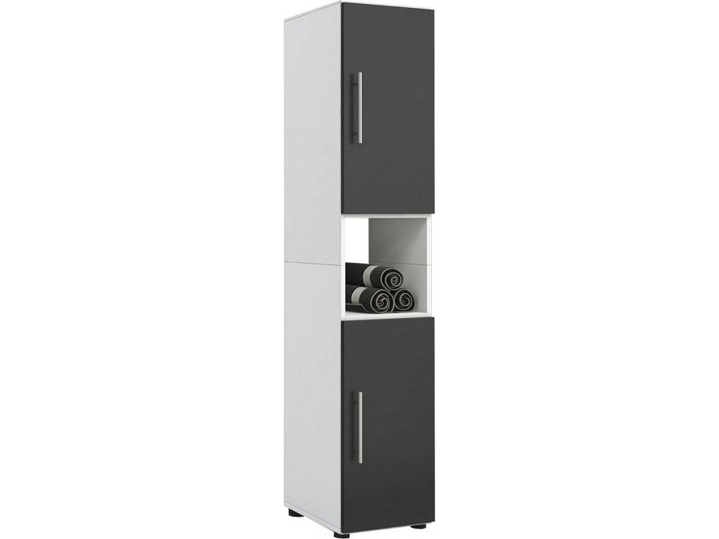 Koupelnová skříňka se dvěma otočnými dvířky a s otevřenou poličkou se vyznačuje nadčasovým a jednoduchým provedením, které se hodí do každé koupelny.