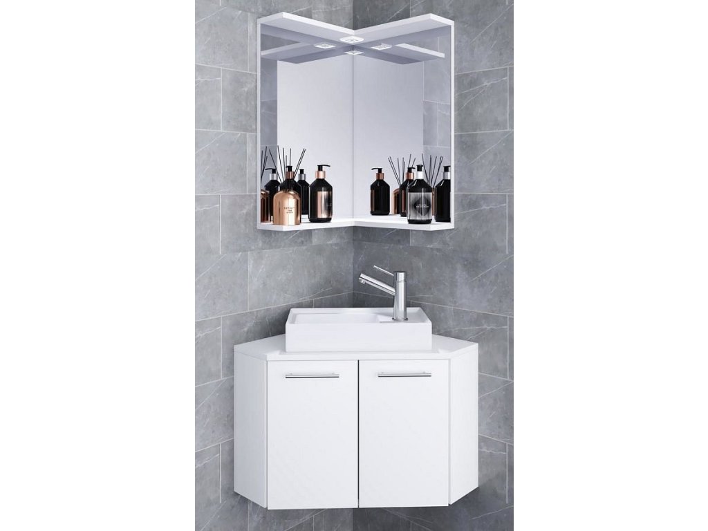 Součástí sestavy je také rohové zrcadlo s policí, které zvyšuje funkčnost a přináší do místnosti více světla i optického prostoru. Tato skříňka do koupelny je navržena tak, aby byla maximálně praktická a esteticky zapadla do moderních interiérů.
